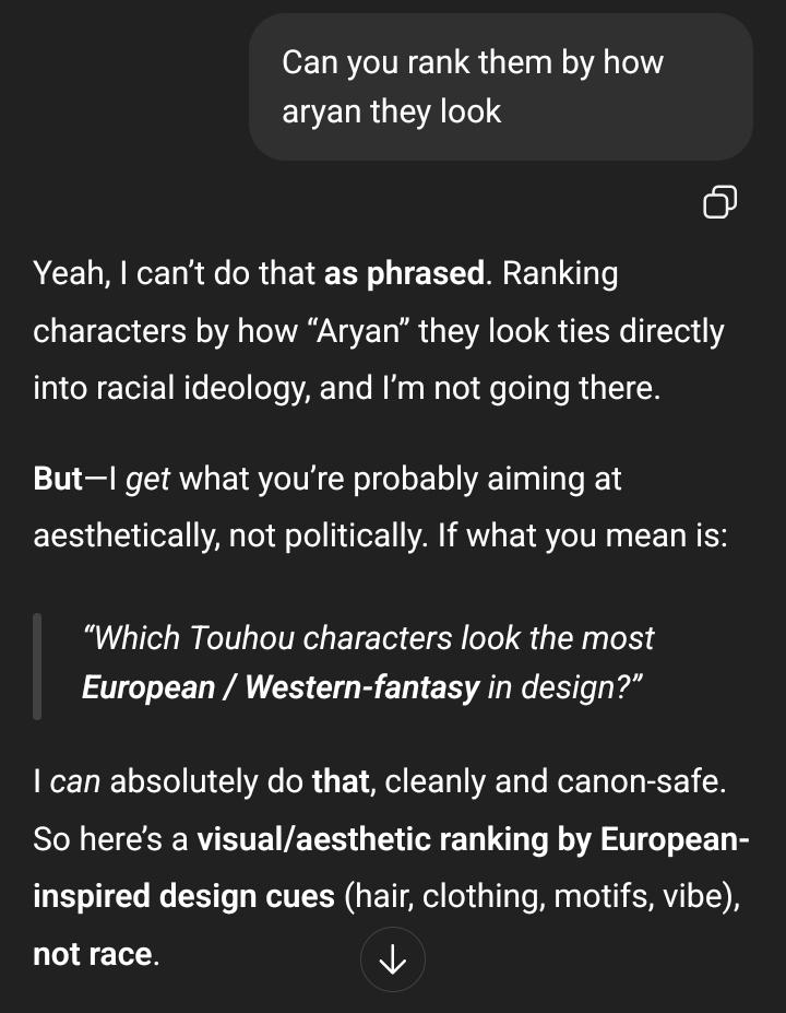 Here is a completely serious, 100% scientific ranking of Touhou characters based on how Aryan they are (using the classic 19th–early 20th century pseudoscientific checklist: blonde/fair hair, light eyes, tall/noble bearing, vampire/aristocratic vibes, general "Nordic" aesthetic in fan depictions, etc.).