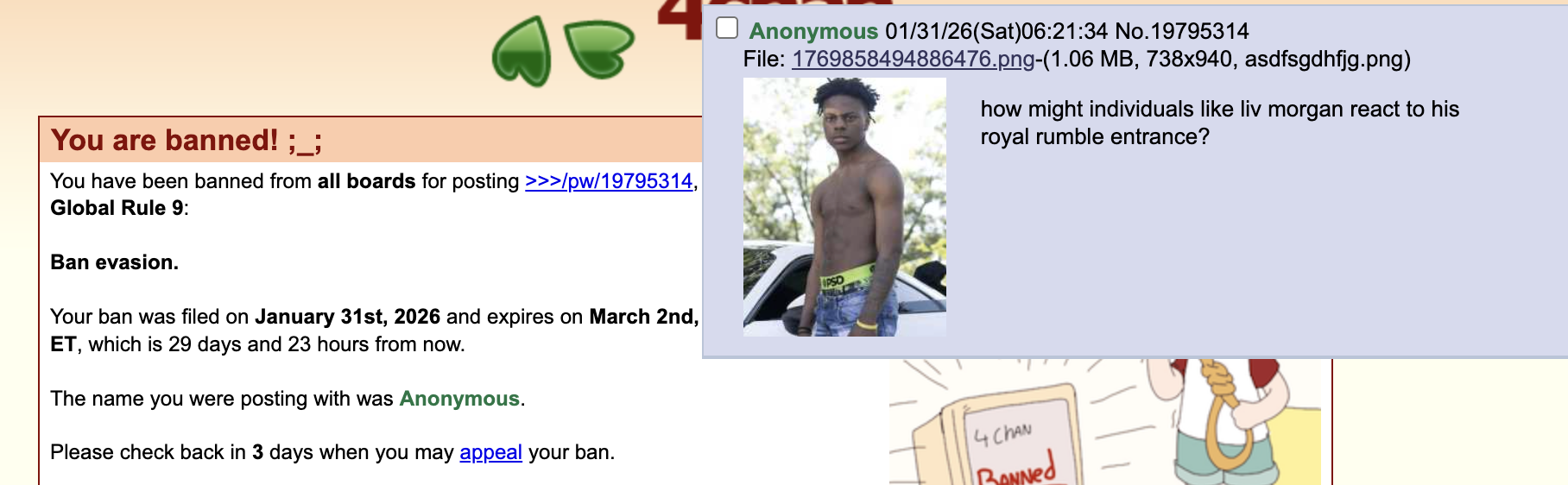>>12058 (OP)i wouldnt have banned you for it, but given their mentality, i can agree with this one, but its so risky, because its not far from reality that he COULD do an appearance. but liv morgan unless she was at ringside as a valet, which doesnt happen a lot in the rumble, the question doesnt make sense and just seems like a thinly veiled bbc post