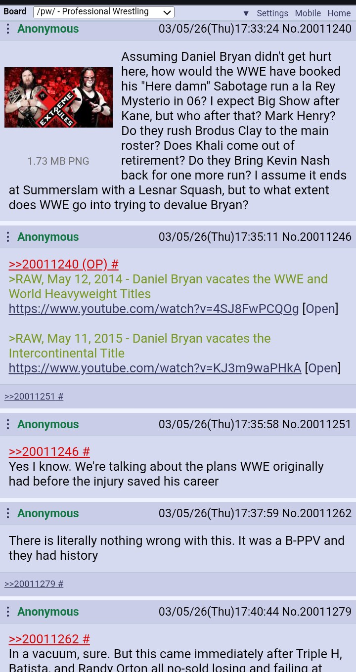 if i have a wrestling take, or an interesting thought about wrestling, i would go anywhere except /pw/. this is coming from an actual poster of wrestling stuff, when i feel like it. im telling you right now, trying to be a tight ass stickler mod is going to get the board deleted.