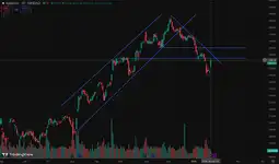 Anyway it's bounced again, and if it falls Under this major resitance line(the bottom canal line) then I will go back to being bearish. Until then I'm just impressed that it's getting top blasted to fuck.