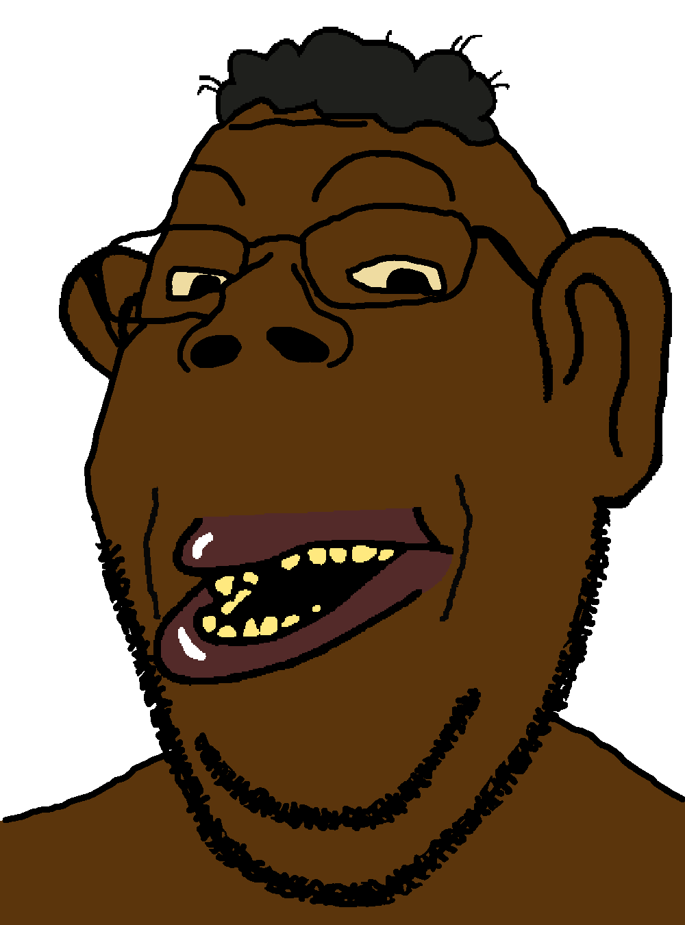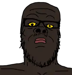 Everything becomes overly simple and colorized in black and white. Soyjaks begin to appear on the walls, on the streets, in the sky, as the sun. You drop the bottle in shock. You look to the dealer for answers, but he seems frozen in time. Before you can process what's happening, a figure starts descending from the sky.