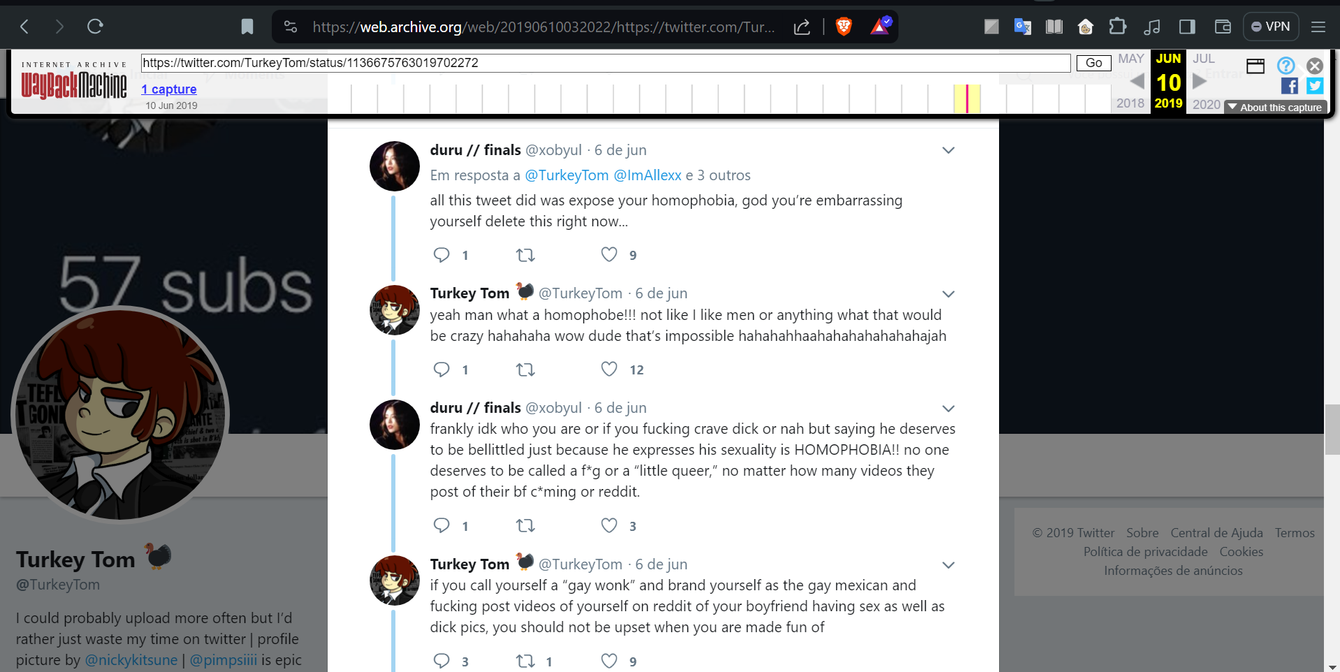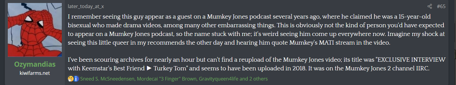 >Mumkey said turkey tom was bisexual on a podcast in 2020 too. Turkey tom now denies ever being a faggot.