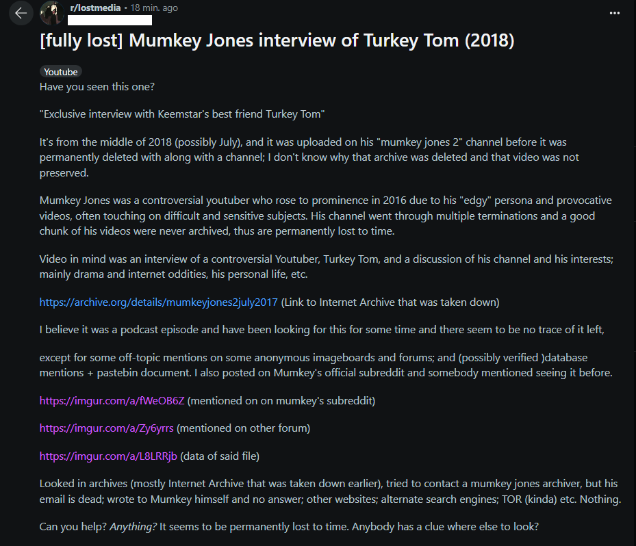 Looked in archives (mostly Internet Archive that was taken down earlier), tried to contact a mumkey jones archiver, but his email is dead; other websites; alternate search engines; TOR (kinda) etc. Nothing.