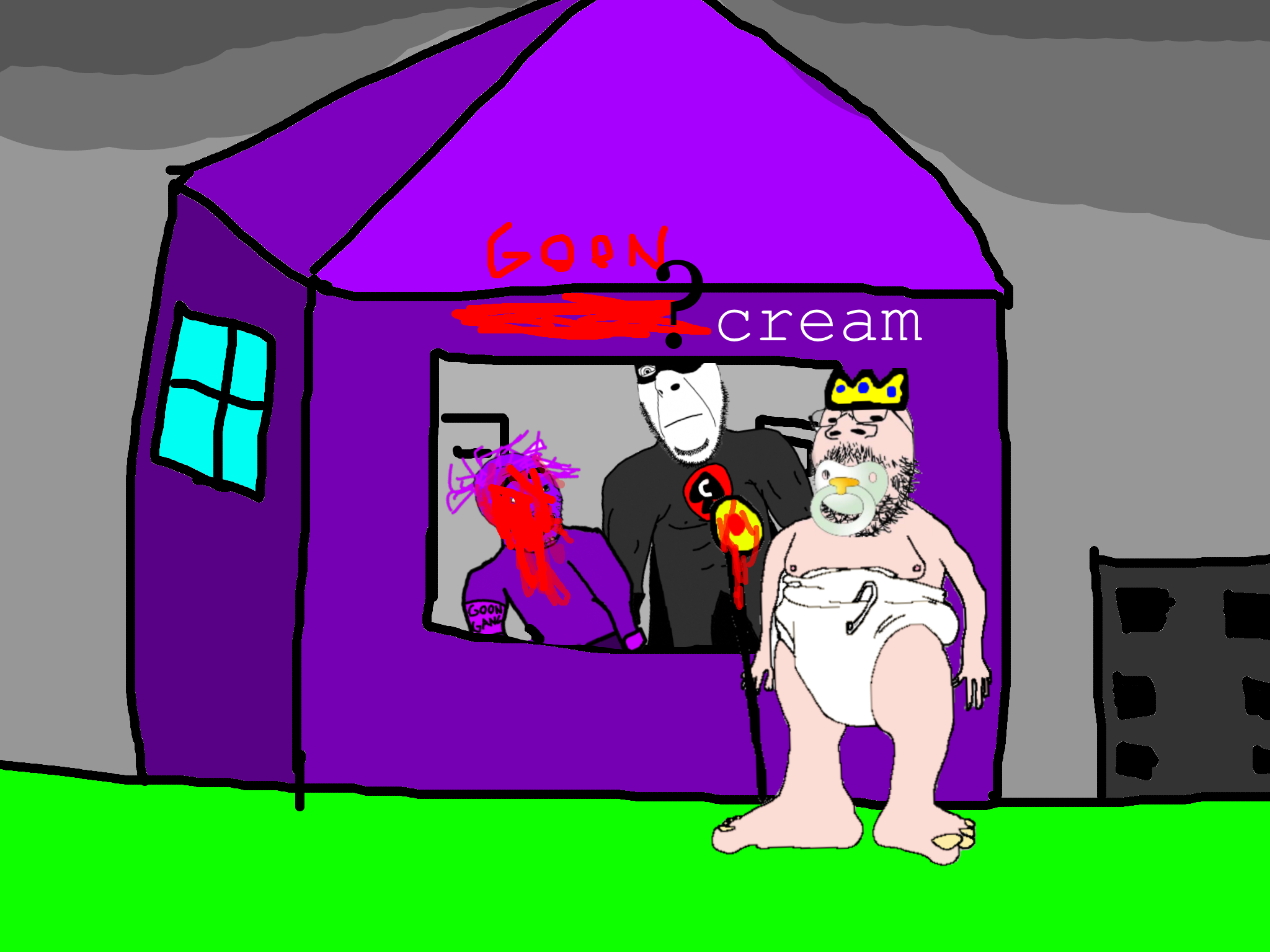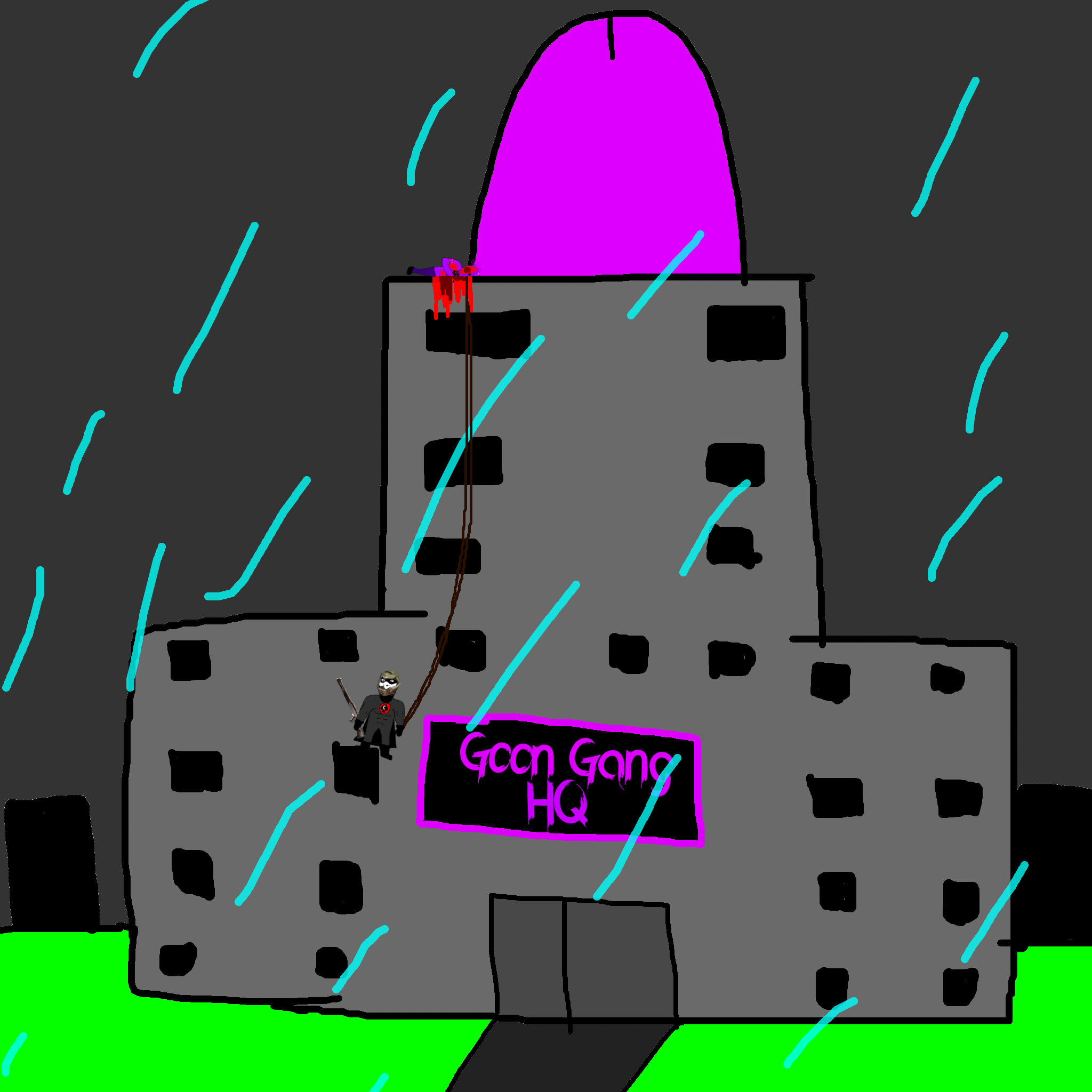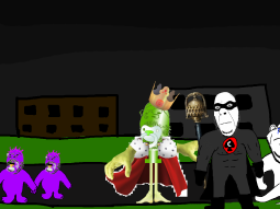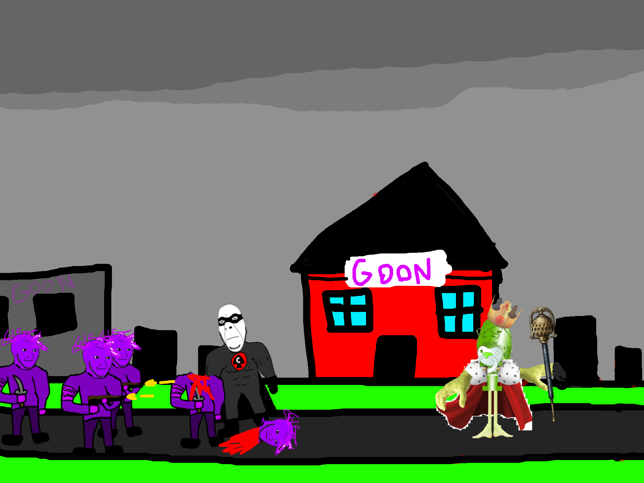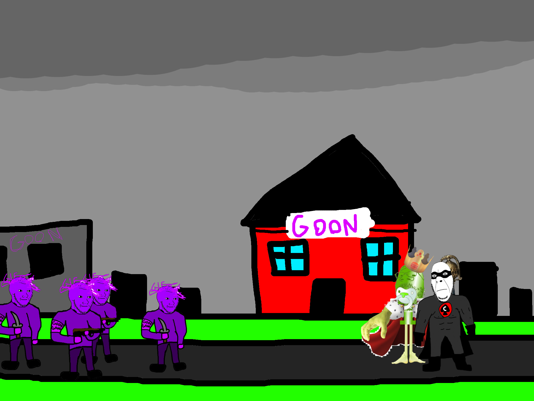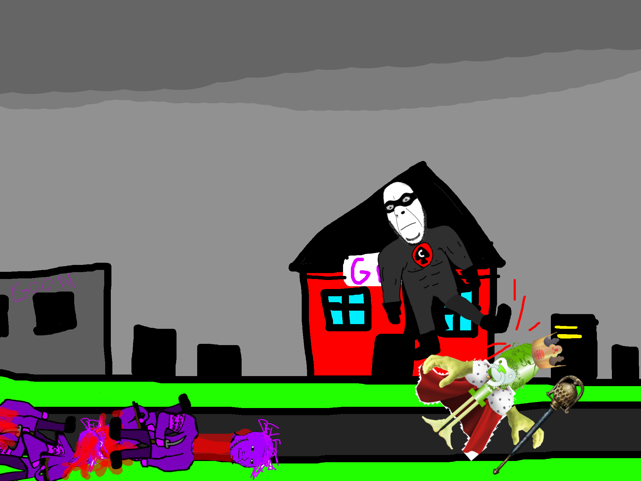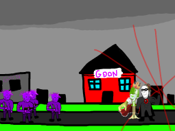 >>89196>>89197Despite his cries, you move on from the swede. After walking for a few hundred meters you come across a group of gooners, they have put up goon gang propaganda on the buildings.