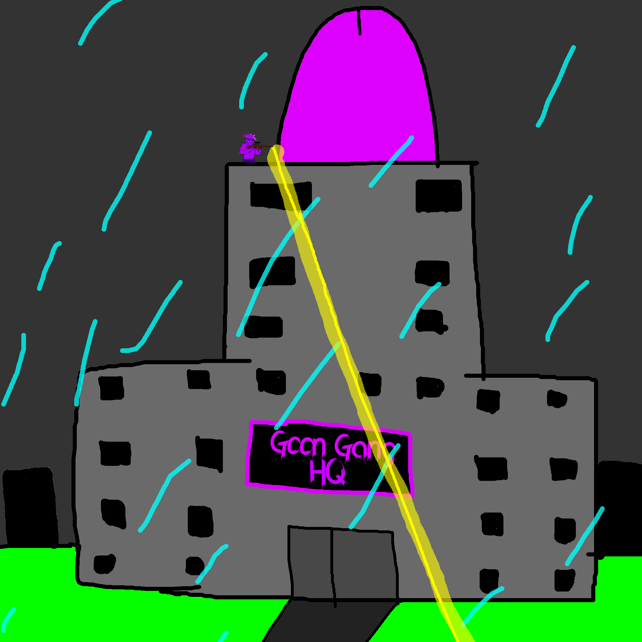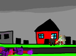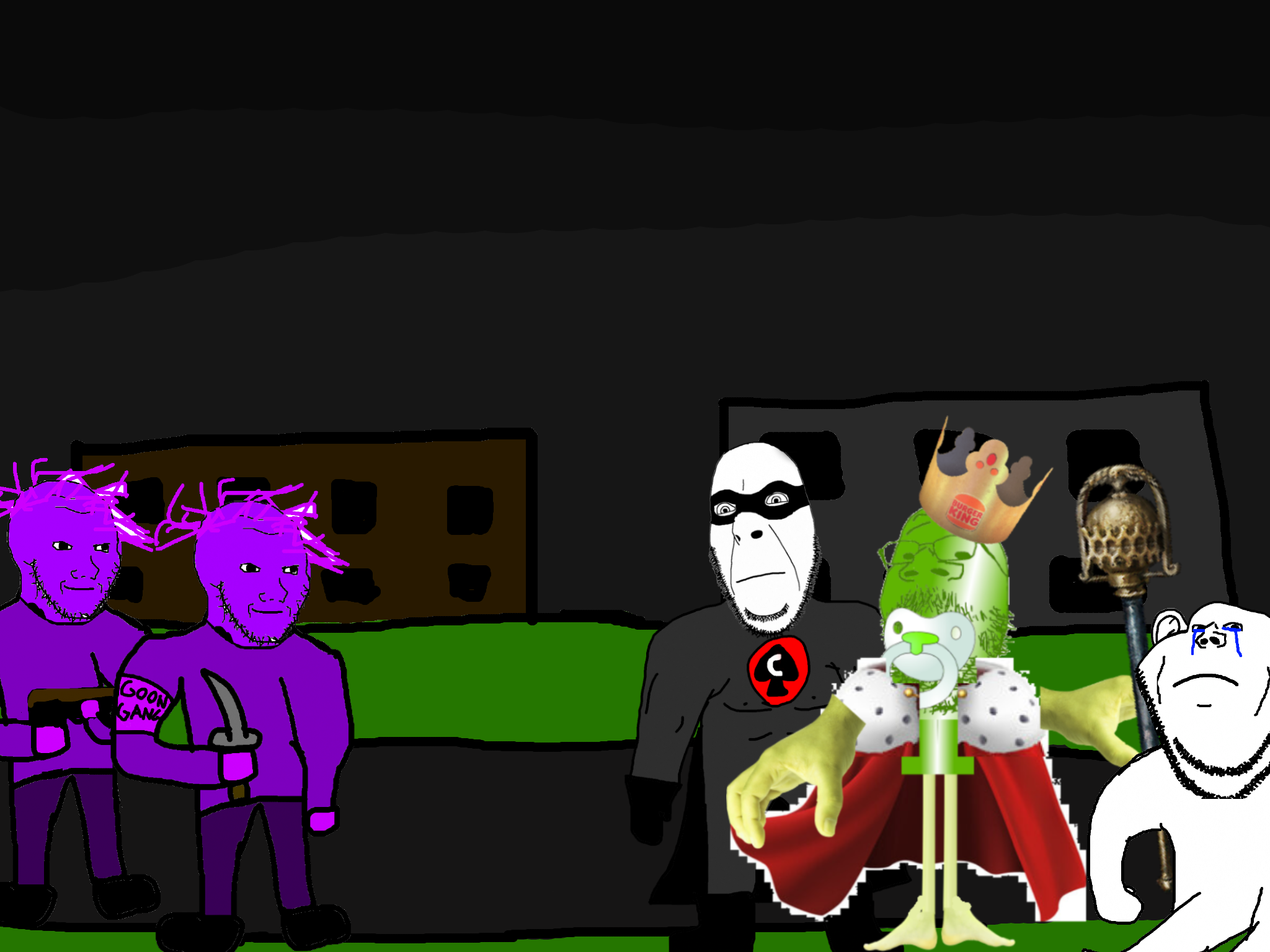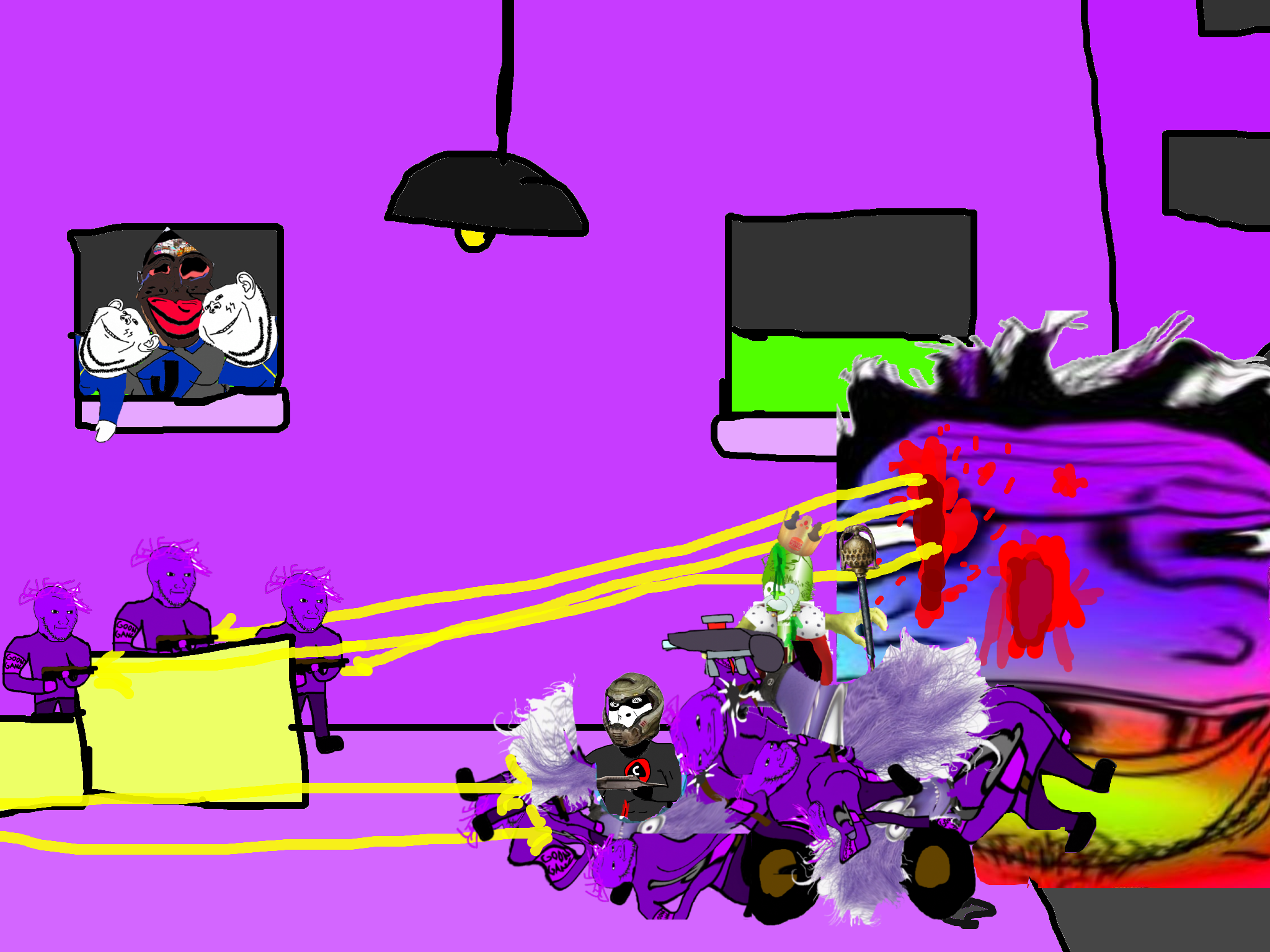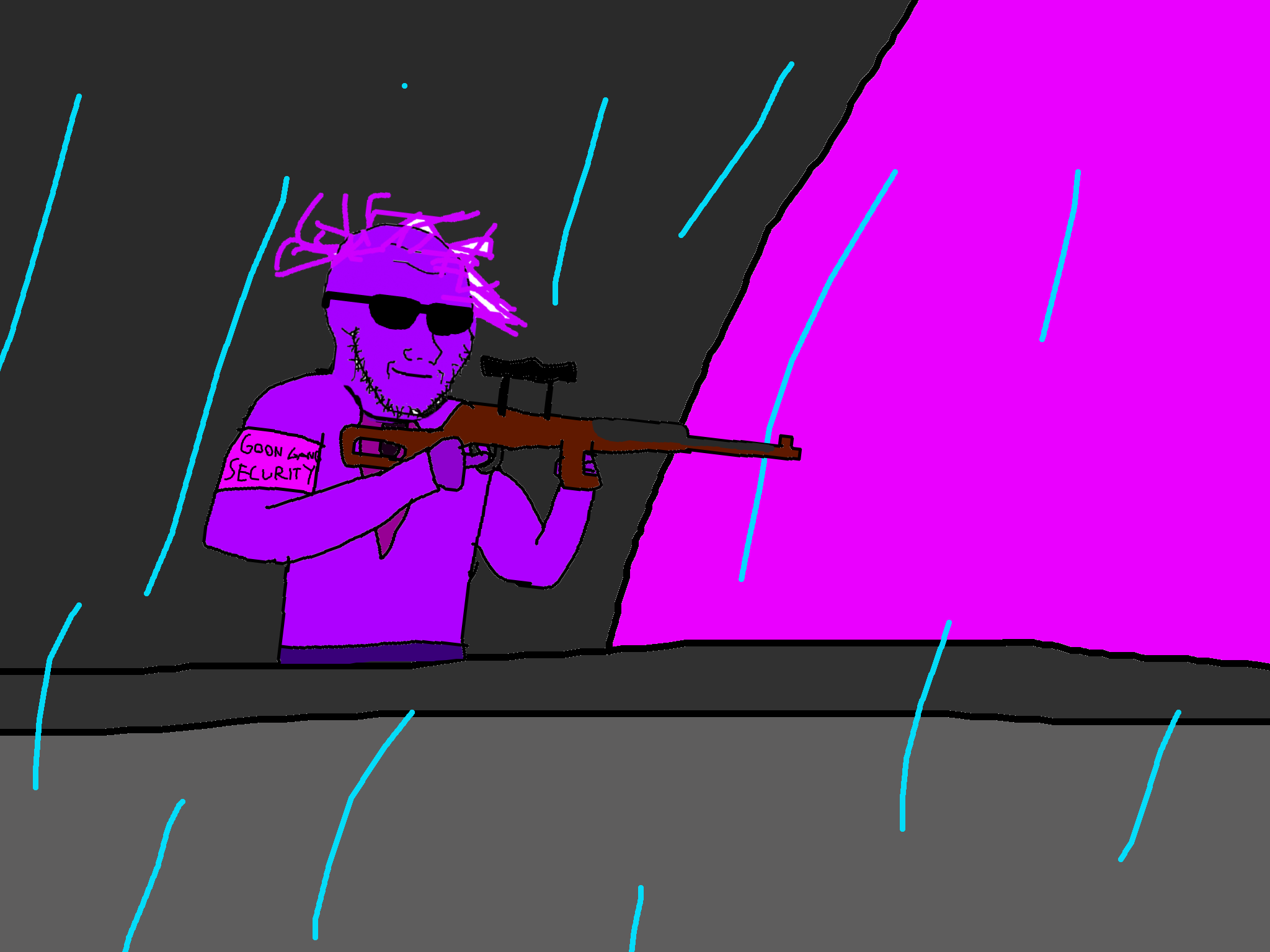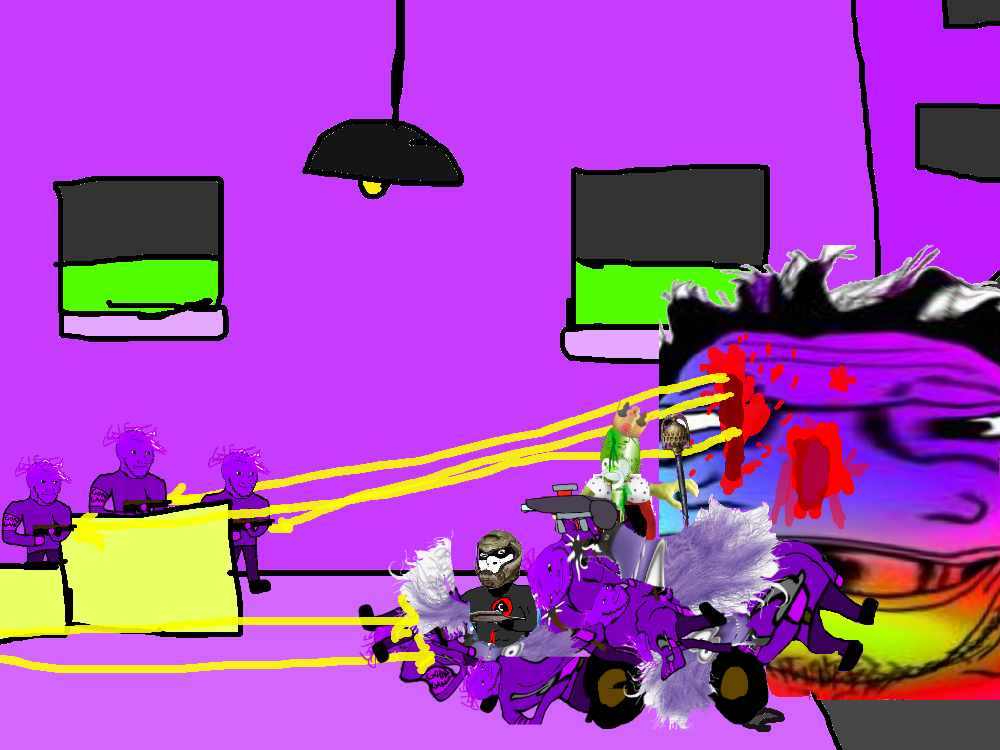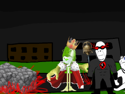 >>89196>>89197Despite his cries, you move on from the swede. After walking for a few hundred meters you come across a group of gooners, they have put up goon gang propaganda on the buildings.