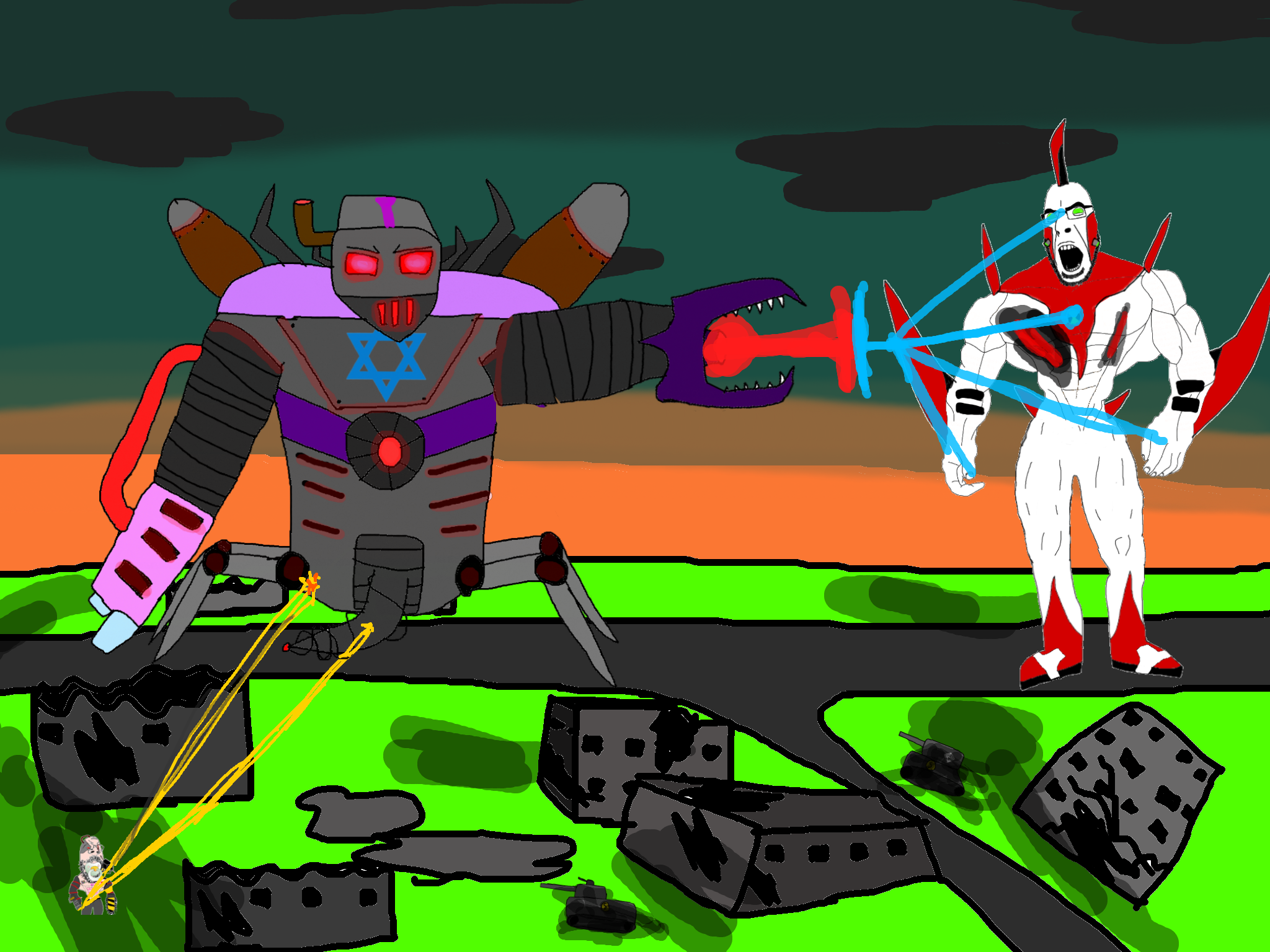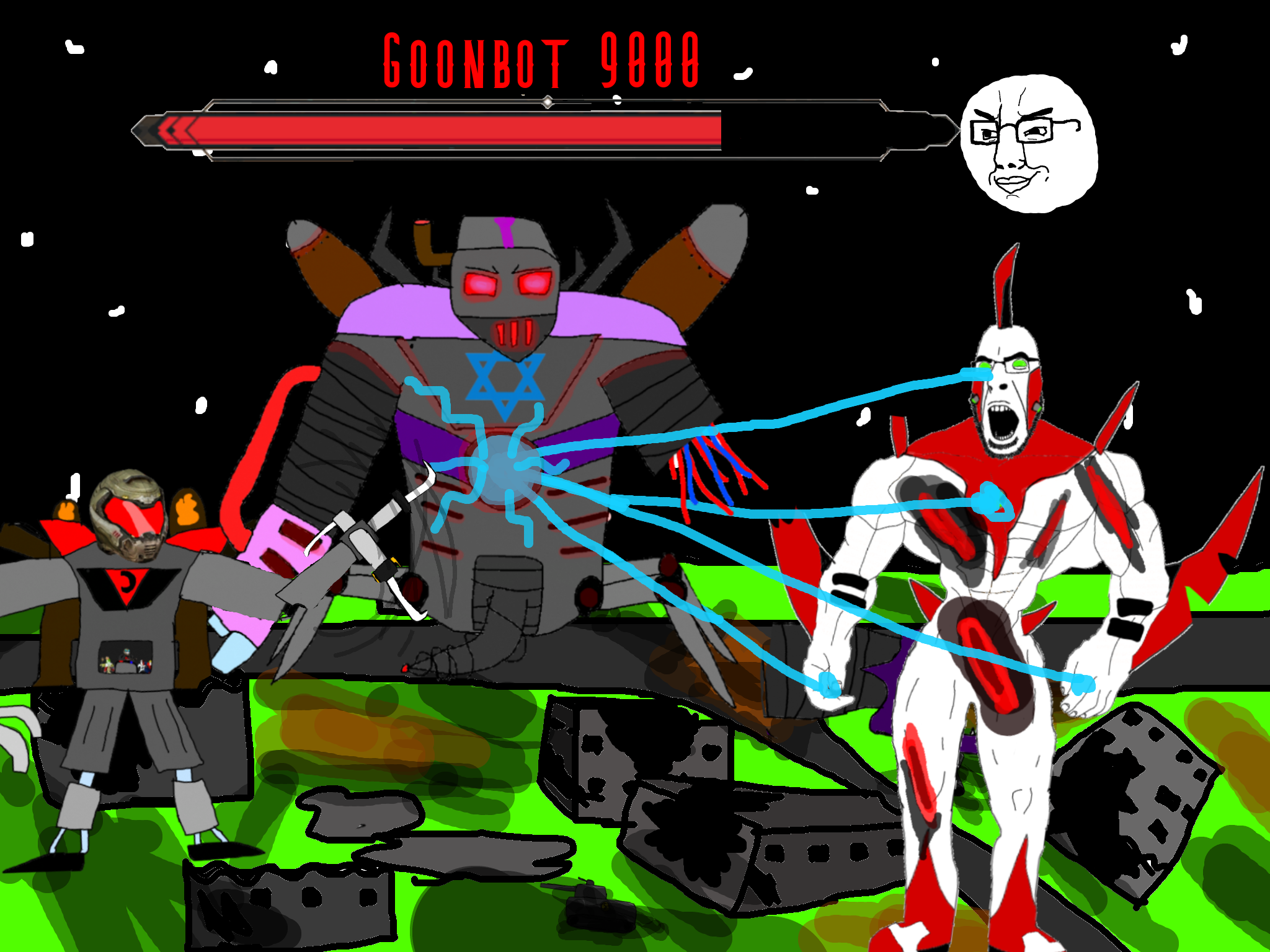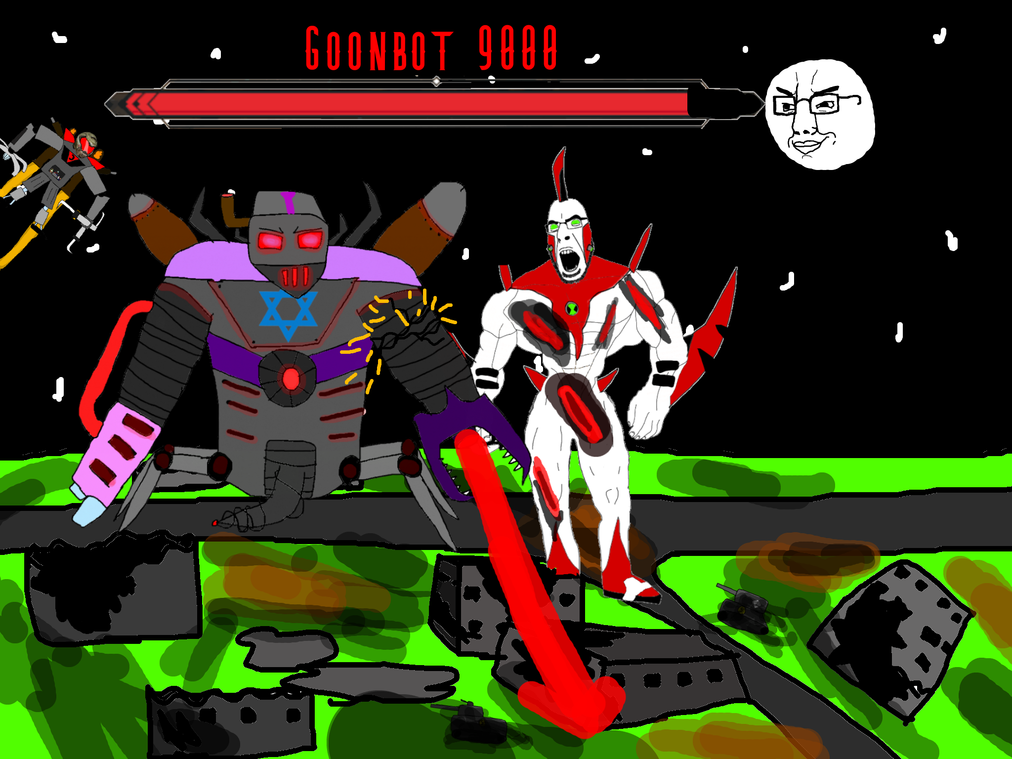>>89922cyborg babyjak who was hiding under the rubble the whole time sees this climbs up the goonbot untill he is near the red chest core, cyborg babyjak initiates his own self destruction sequence and bombs himself his while his last words being "/caca/ won" before dying in a huge explosion that damages the goonbot's red chest spot