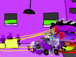 You rip off the head of one of the gooners. The gun gooners shoot but you simply move out of the way because of how slow the bullets are, but the bullets go towards king caca.