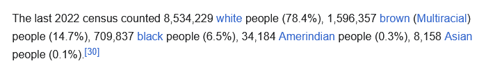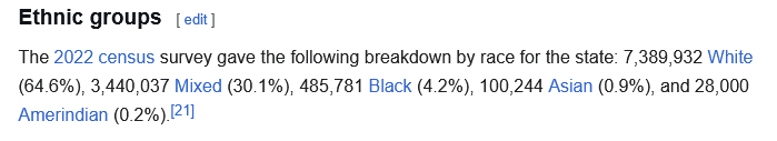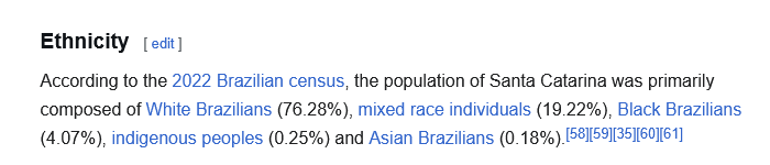 Southern Brapzilian ethnic compositions. Note that ParanΓ‘ has a high number of mixed people because it is the northernmost state and thus has more immigration from other regions of the country. It's not pure Aryan heaven, but probably more than many Amerimutt states currently.