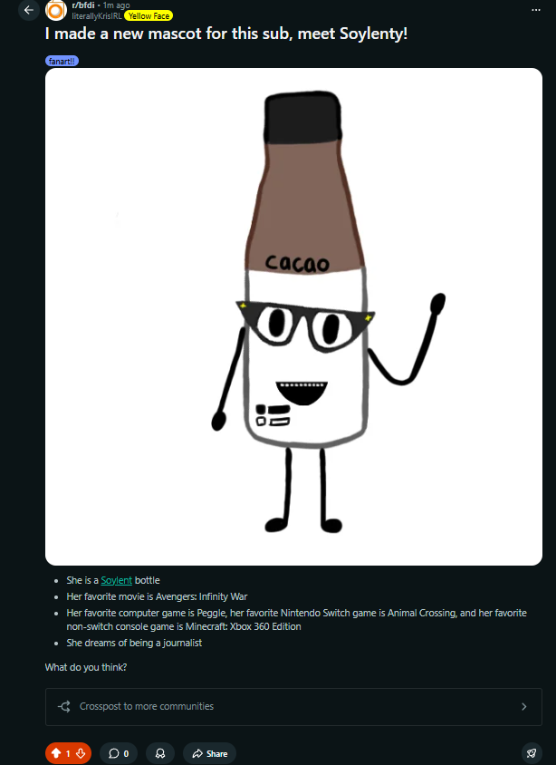 >>249887Kek what if we managed to get soylenty in bfdi? Jacknjellify likes to add fan characters all the time so it could be possible kek