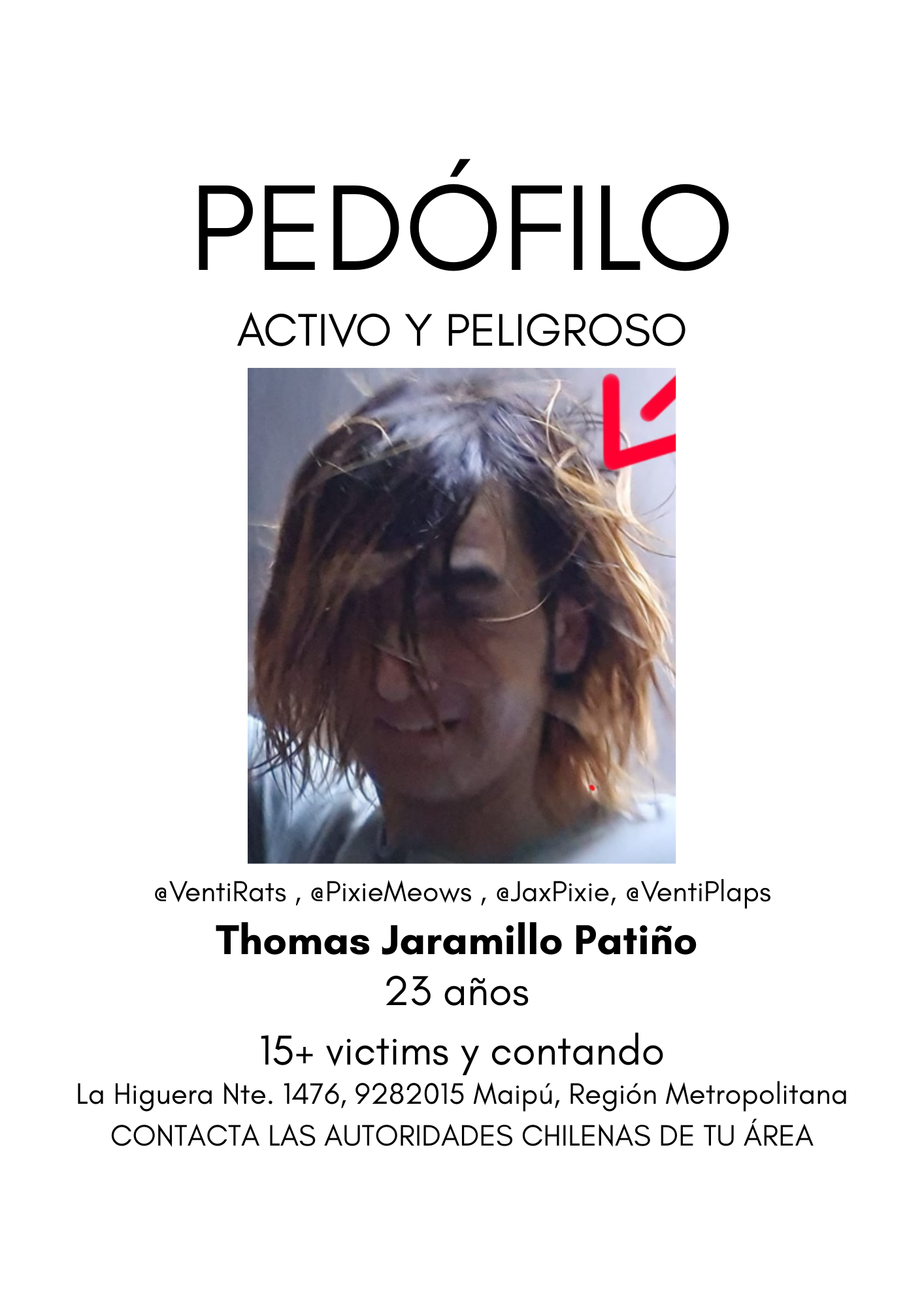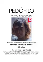 he is a child groomer with 15+ victims and we are currently planning to put up flyers around chile. if you want more information about his actions, check out