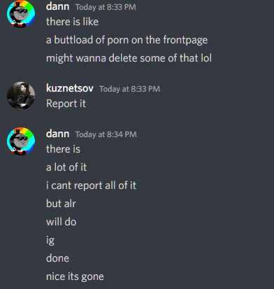 My point is that I'm not letting things like porn stay up for days on end