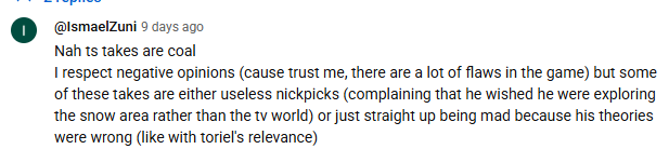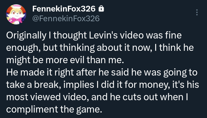>>103832>>103816Checked his X and watched a couple of his videos. I like this guy. It's interesting to see what inspired and influenced him. His critiques and observations in his other videos are largely astute. I'd enter dbdr mode too if I had to play those retarded Switch sequels that shouldn't exist.