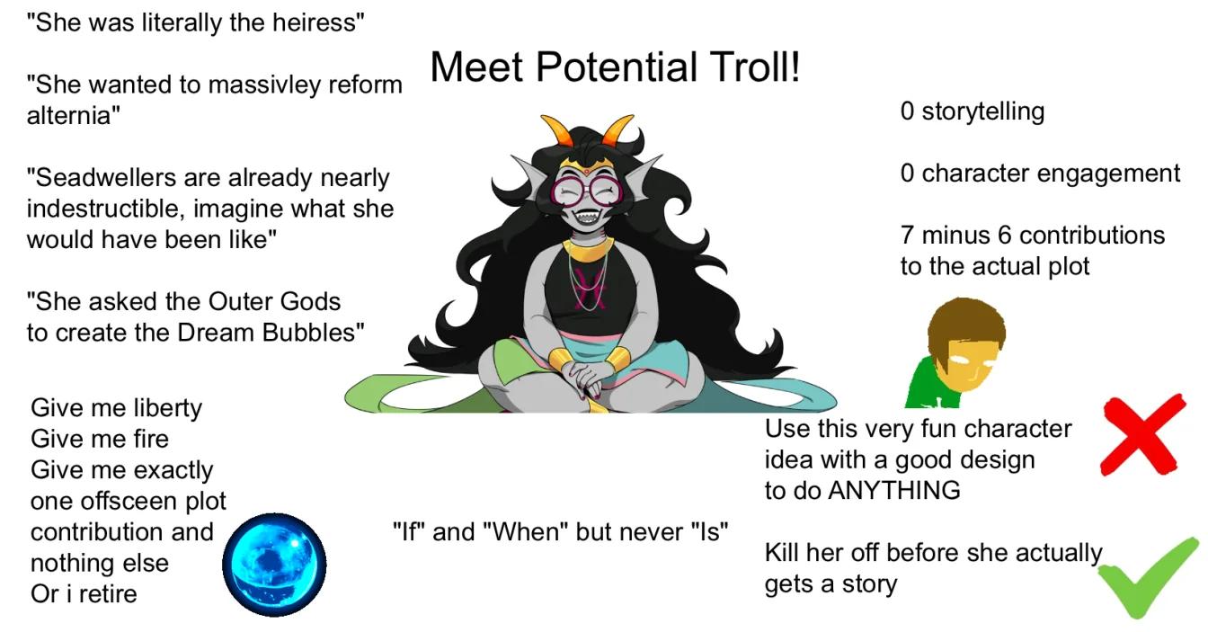 His design is his only real redeeming quality. His dialogue is sort of funny with the transpecies bullshit, but the overuse of sex jokes is annoying. Also, Cronus hit on Eridan… I normally view fiction and reality as two separate realms, but Eridan feels real to me. I don't wanna see an adult character hit on the 13 year old version of him.
