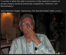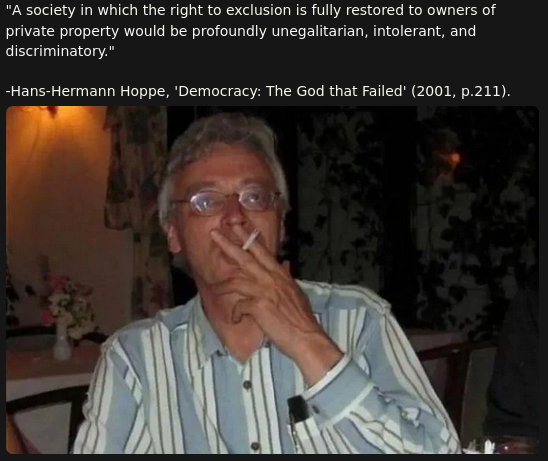 >>2399505 >Your example doesn't perfectly fit with your ideal model Who would have thunk it. I'm just saying that Orania-like societies with "private borders" (aka Hoppe's covenant communities) are what would emerge in a libertarian world.