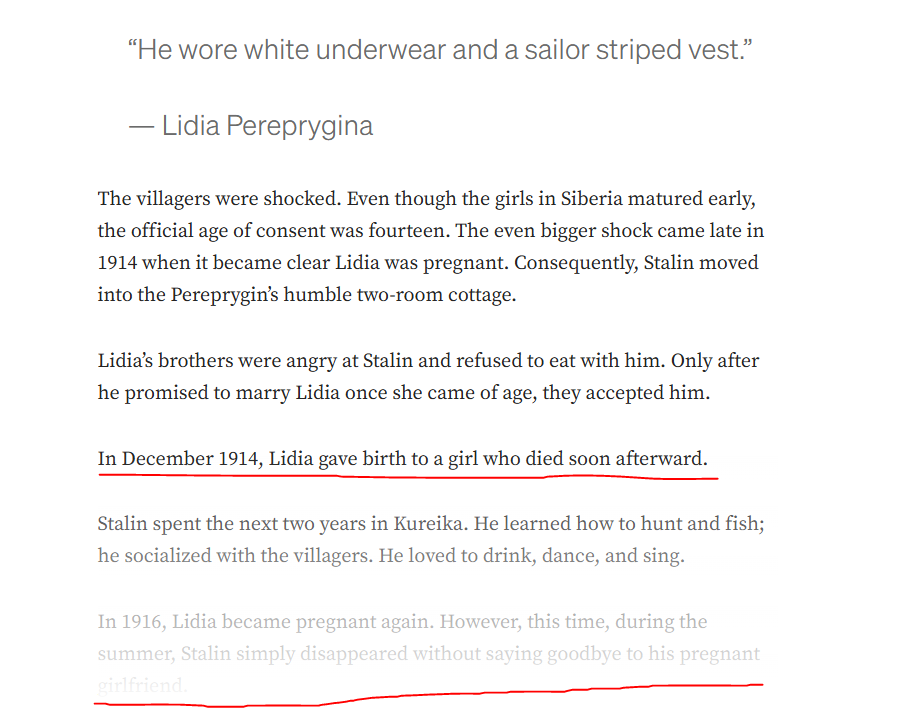 >>2537463On the wikipedia article it says she said her non-dead child was born in either 1915 or 1916. Also, its possible shes just lying about the dead child and that it never existed at all and that the living child isnt stalins.. I dont doubt stalin lived there but i wouldnt trust women claiming that they fucked the leader of their country.