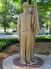 The statue has a Union Soldier, A Confederate Soldier, and a Black in between the two.