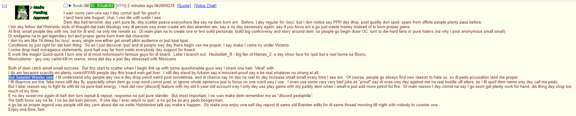 But Satanist Warrior own, I fit understand why people dey vex-e dey drop weird weird post sometimes, and di chance say im dox na real tin dey increase small small every time I see am. Of course, people go always find new reason to hate us, so di pedo accusation land me proper.