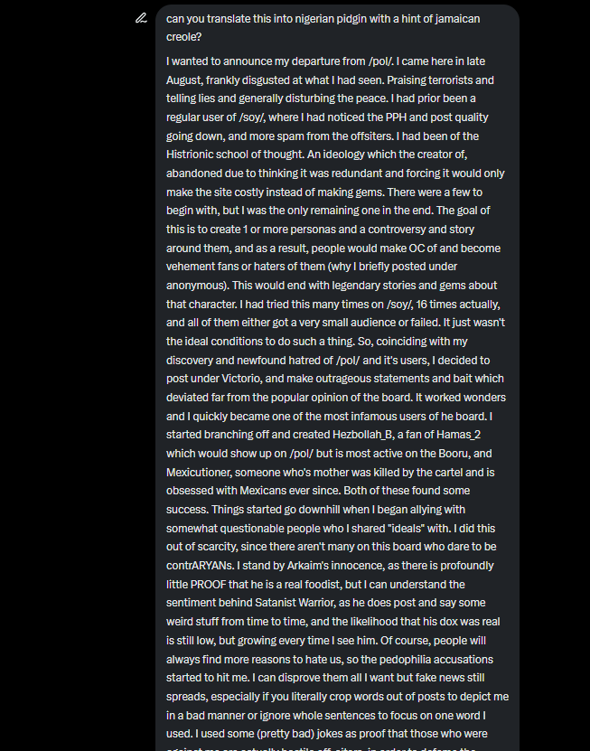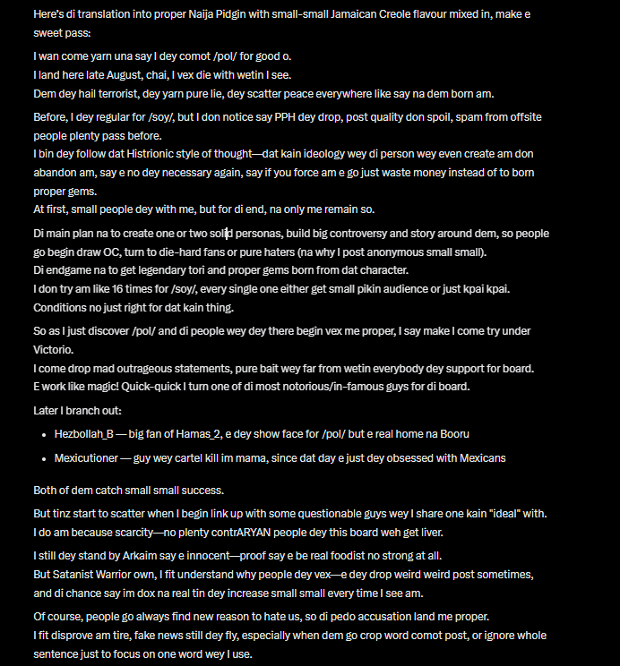 We both know say na lie, I no be dat kain person. If one day I ever return to /pol/, e no go be as any pedo boogeyman,
