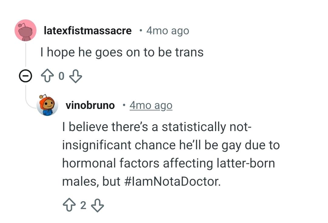 >>2691006I think weirdest thing I seen all day in the comment section is that they wish their son will be gay