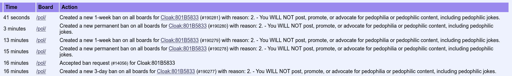 >>2714533It's not me. I just screenshotted the weirdo nigger from fuentes thread. The ban severity was changed from forever to 1 week, now it's changed back to forever in /bans/.