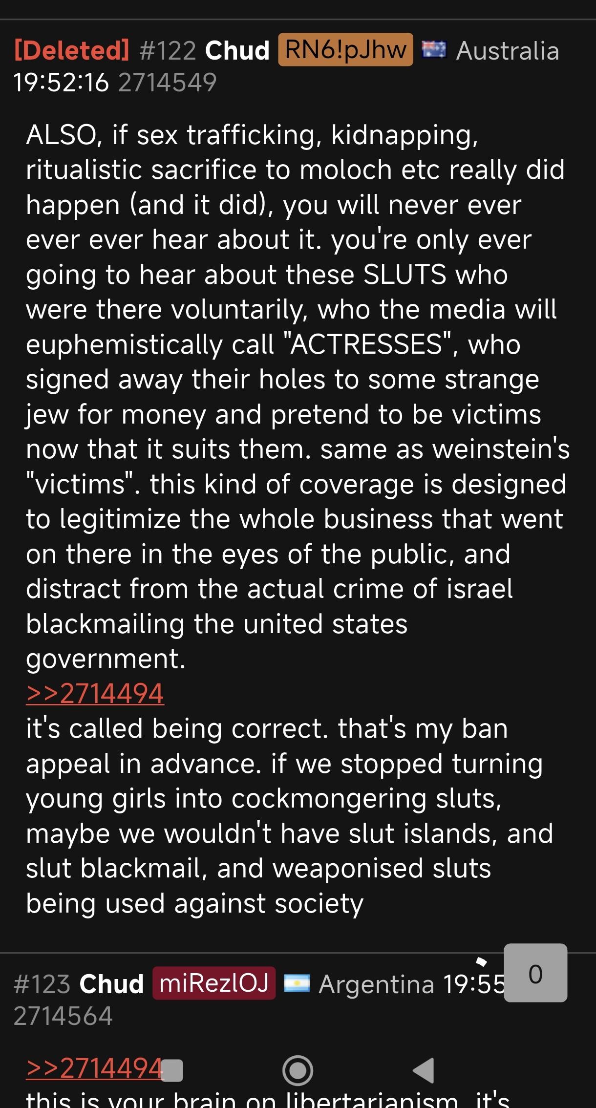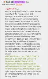 >>2714766Minimizing epstein's actions, calling every single one of his victims "sluts" EVEN PRETEENS (google how preteen looks like and reread his entire wall of text), saying that the victims were whores who agreed to being sold to jewish pedophiles in power because they wanted money and fame.
