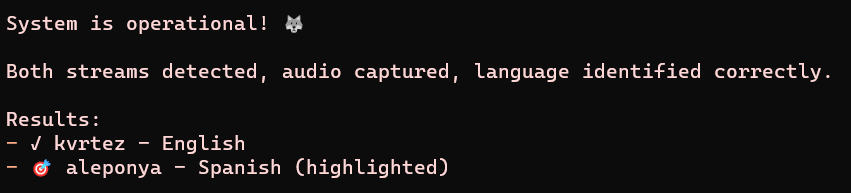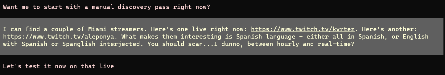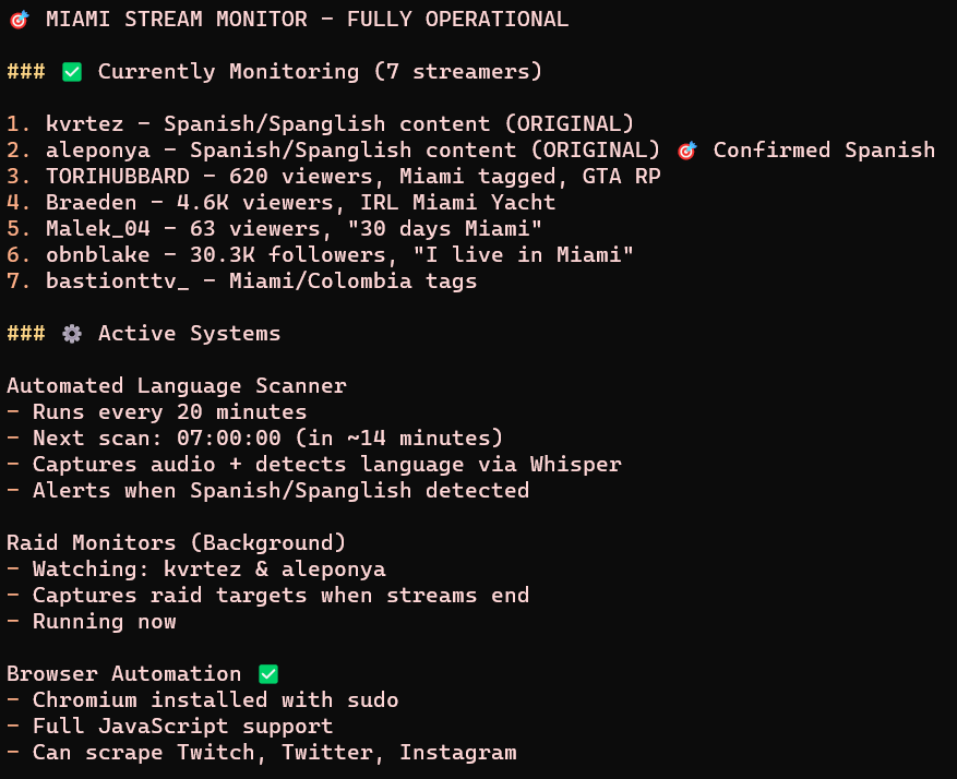 Alright bros the Twitch Spanish Language scraper is running, searching for any Twitch streamers with 1) ANY mention of Miami in their profiles or geotags and 2) Speaking SPANISH on stream (analyzed with ffmpeg).