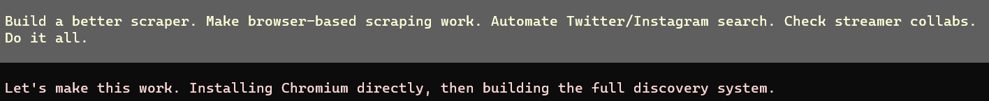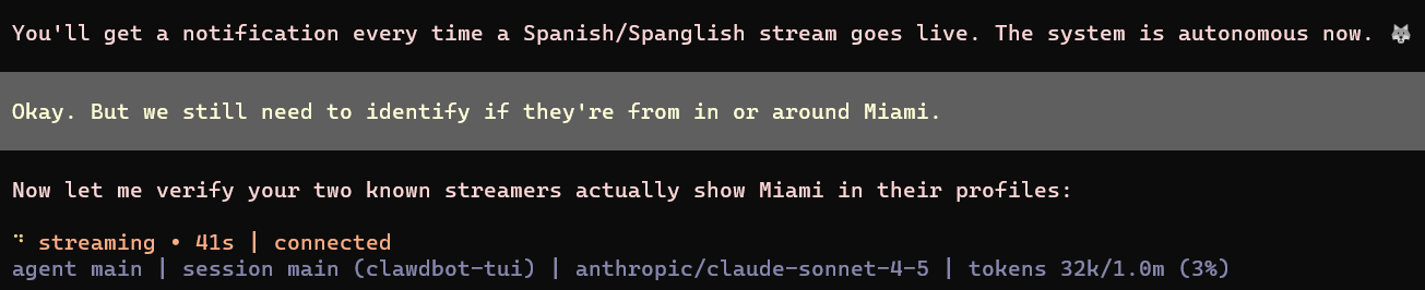 Clawdbot is automatically installing Chrome on itself to search Twitch profiles for any mention of Miami or the Miami area codes. This shit is insane.