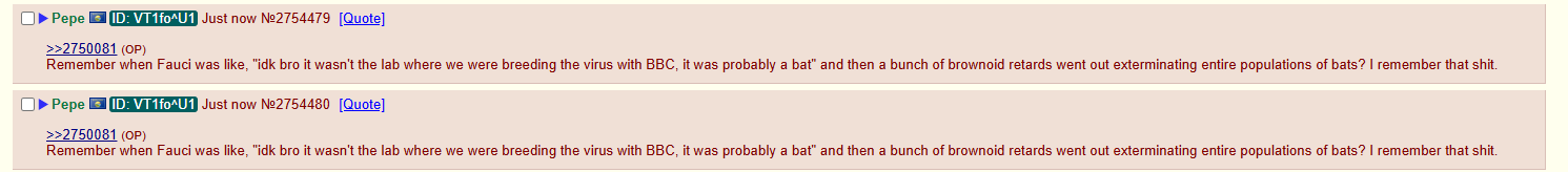 >>2750081 (OP)Remember when Fauci was like, "idk bro it wasn't the lab where we were breeding the virus with BBC, it was probably a bat" and then a bunch of brownoid retards went out exterminating entire populations of bats? I remember that shit.