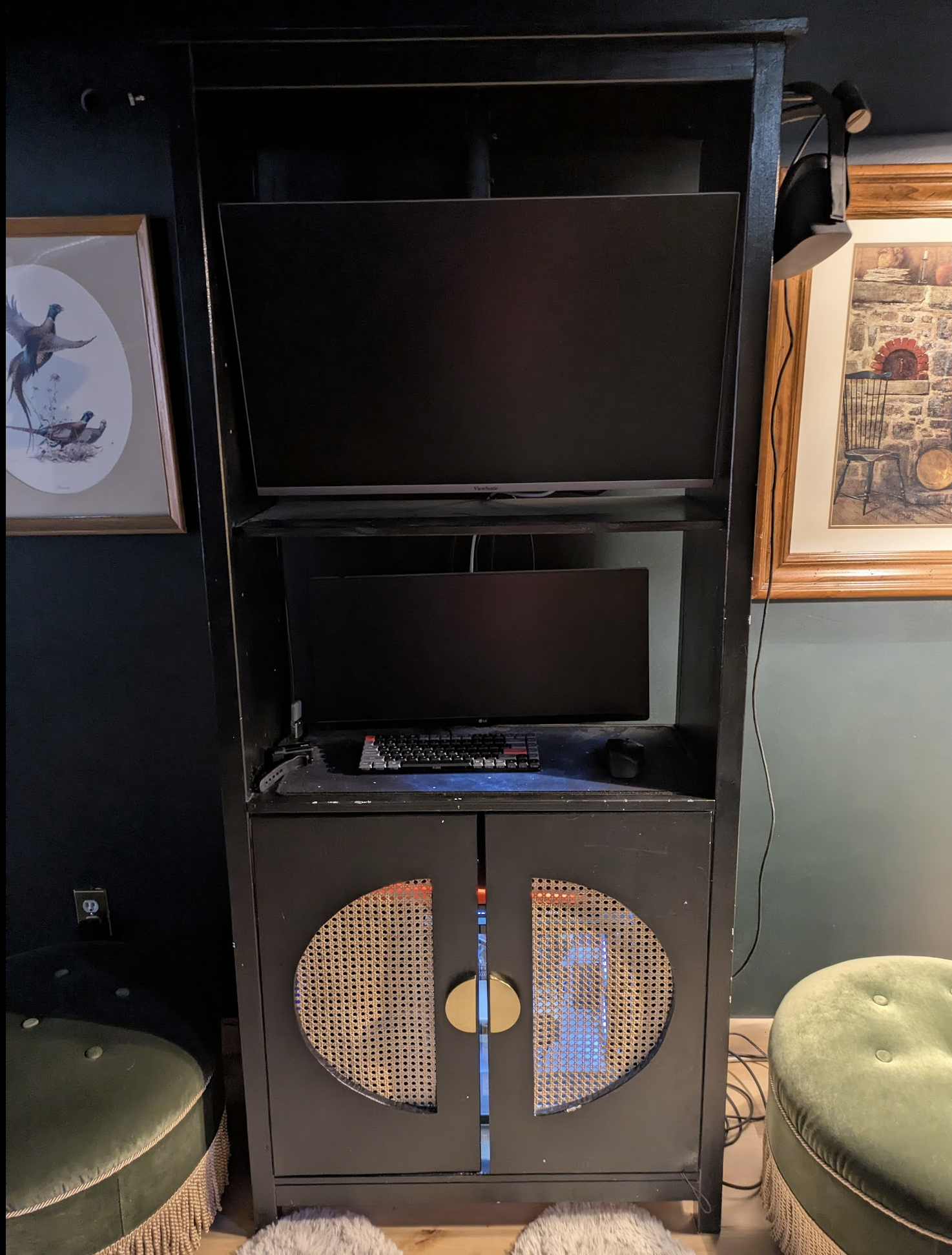 I built this armoir thing from a basic cabinet, added the cane backing panels with an exhaust fan mounted in side the cabinet with the monitors hard-mounted onto the furniture. I think a lot of gaming setups look like a gay pride rave, tried to go for a something I wouldn't mind looking at for years.