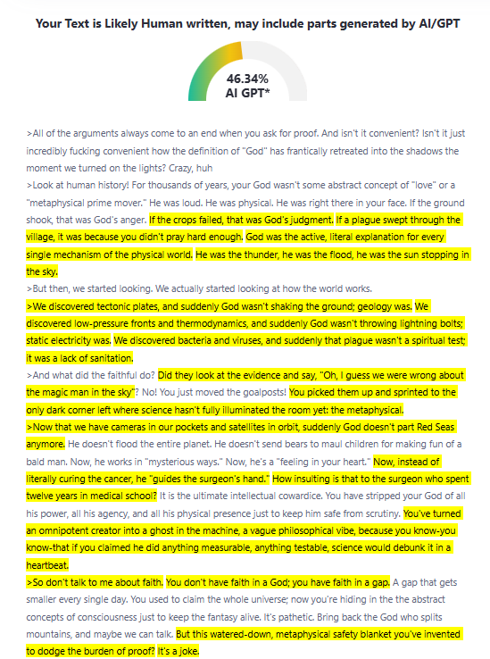 >So don't talk to me about faith. You don't have faith in a God; you have faith in a gap. A gap that gets smaller every single day. You used to claim the whole universe; now you're hiding in the the abstract concepts of consciousness just to keep the fantasy alive. It's pathetic. Bring back the God who splits mountains, and maybe we can talk. But this watered-down, metaphysical safety blanket you've invented to dodge the burden of proof? It's a joke.