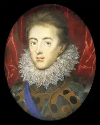 By all accounts, James was at first infatuated with Anne and, in the early years of their marriage, seems always to have shown her patience and affection.[56] They attended the wedding celebrations of courtiers and danced in masque costume.[57] The royal couple produced three children who survived to adulthood: Henry Frederick, Prince of Wales, who died of typhoid fever in 1612, aged 18; Elizabeth, later queen of Bohemia; and Charles, James's successor.