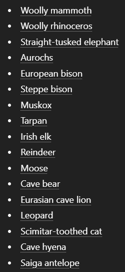 "Wooly mammoth" "cave bear" "auroch" are literally just elephant, kodiak bear and cow, boring ass extinct animals identical to modern living animals, they should bring back the pterodactyl instead