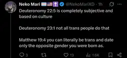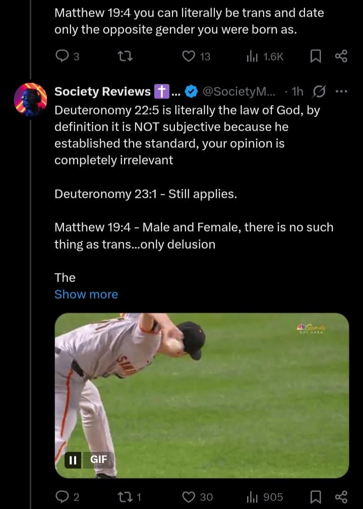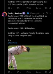>1: The woman shall not wear that which pertaineth unto a man, neither shall a man put on a woman's garment: for all that do so are abomination unto the Lord thy God.>2: He that is wounded in the stones, or hath his privy member cut off, shall not enter into the congregation of the Lord.>3: And he answered and said unto them, Have ye not read, that he which made them at the beginning made them male and female, and said, For this cause shall a man leave father and mother, and shall cleave to his wife: and they twain shall be one flesh? Wherefore they are no more twain, but one flesh. What therefore God hath joined together, let not man put asunder.TLDR: tranny tries to say that everything in the bible against troons is merely fake o algo