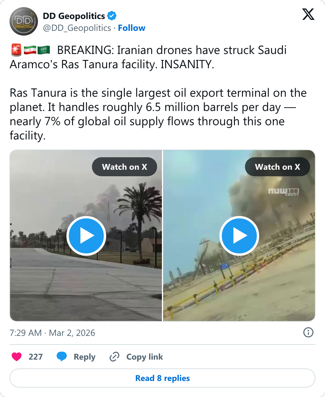 >>2964395but when we talk about the price of oil, we're talking about crude oil - not petroleum or diesel or whatever. the price of petroleum will go up from this, but the price of oil won't necessarily. i think it's possible oil could go up if people are scared that iran will target actual drilling sites. for reference ukraine has not (even once) attacked a russian oil drilling site during the entire 4 year war