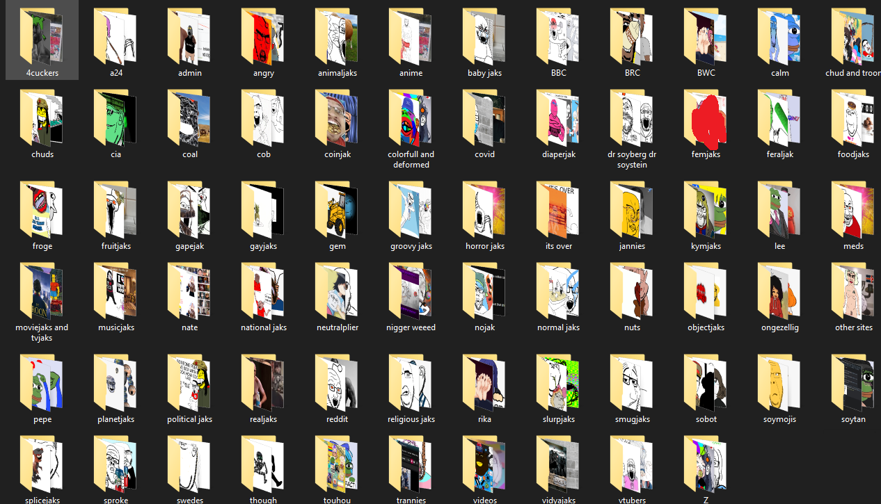 Everything I have downloaded is unorganized maybe these days I will make some folders (soyjaks,gigas,pepes,tamas,baittans,alternate history maps,good art,regular memes,ns edits,)