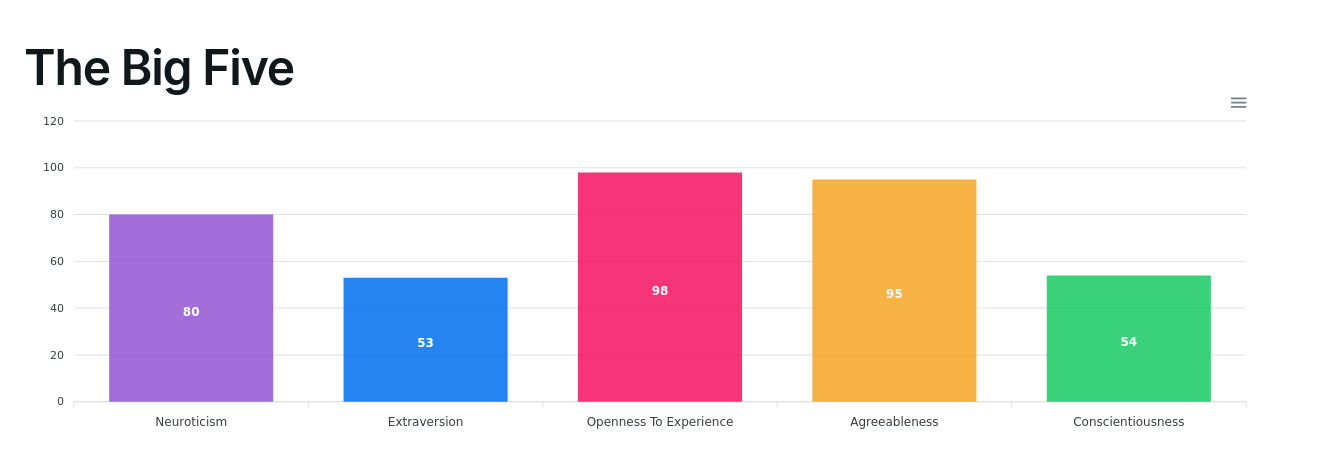 >>3055535General personality tendecies used that has a lot of evidence and research backing, all 5 are heritable at around 50%.