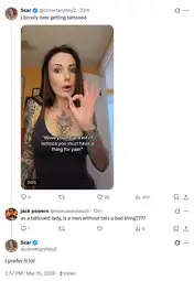 >>3054865>>3054872you think its ok for a woman with a lot of tatoos to prefer a male with none?