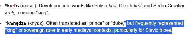 >>3063547Knyaz' is still proto-germanic for king and was used as such in medieval contexts (IE, the princes of lands.)