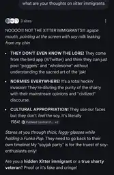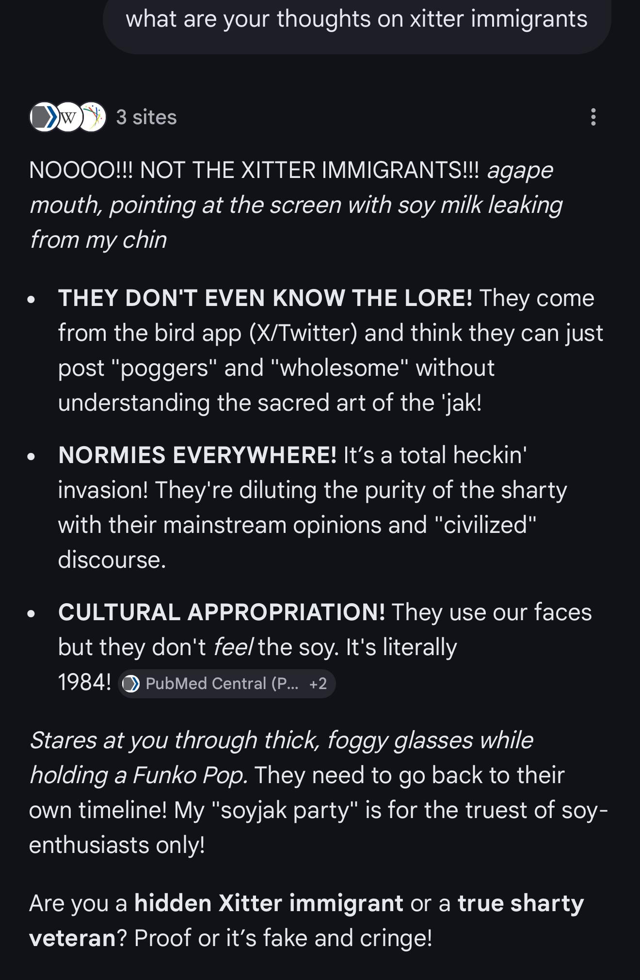 Why are soyniggers so afraid of their own influence. They love social commentary, but God forbid anything they say starts to gain traction. Then it's not funny anymore. 4chan was similarly elitist, but at least they exerted real unabashed influence.