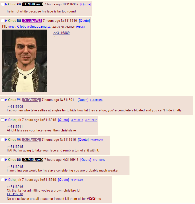 >>3124155In the thread over a day ago or so there was an australian no vpn. They were both talking and the colorjak posted the selfie, and said he posted it before too. The australian immediately called him out on being obese even though they were both on the same side at the time.