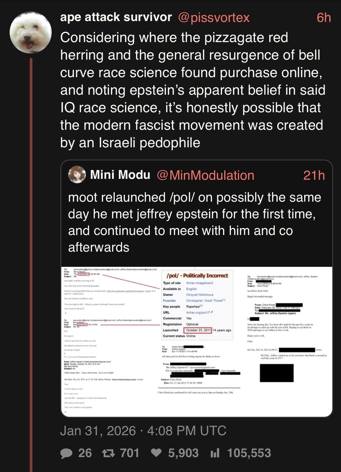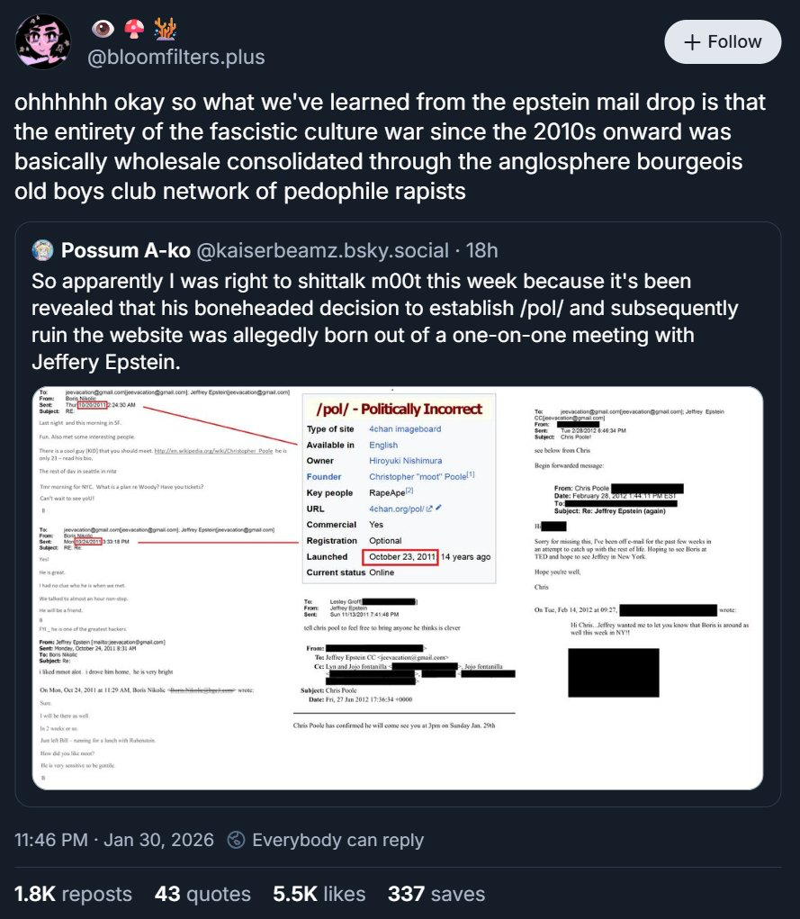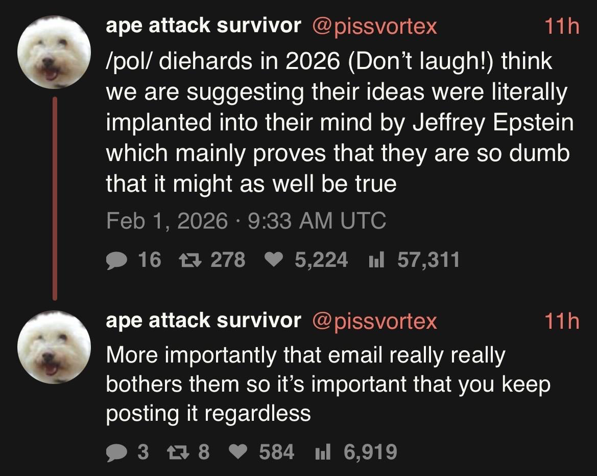 >>3156414evendoe the thai tranny is baiting, there are actual braindead retards who believe this, if anything mossad and israel have more to do with /pol/ than epstien what with them constantly shitting it up for years from all the israeli ips the 4cuck hack released
