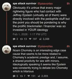>>3156425>OH MY FAUCI, CHOMSKY AND EPSTEIN ARE LIKE THOSE HECKIN' DEBATING RETARDS FROM YOUTUBE SHORTS!! THAT'S HECKIN' HILARIOUS!Lefties…