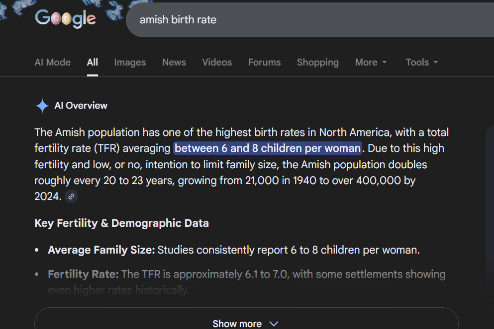 >>3158032>germanic whites>traditional religious society>extremely high birth rates>rejection of modern society and it's degeneracy>live isolated in their communitiesThe amish might be the ultimate aryans geg