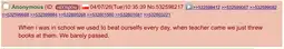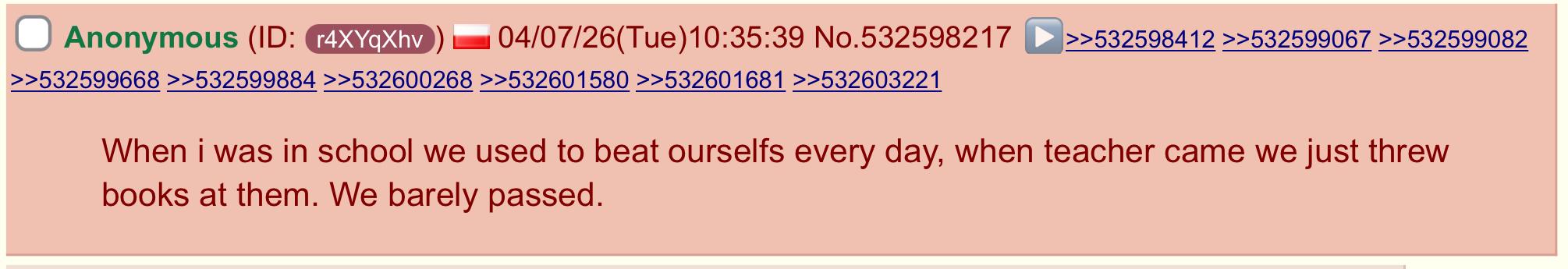 We aren't much better. We had two of the boys bathrooms shut down because the pipeing got damaged beyond repair and it was like that for a whole year. With the one remaining bathroom we had to sign in and there was a teacher constantly watching the door and timing students.