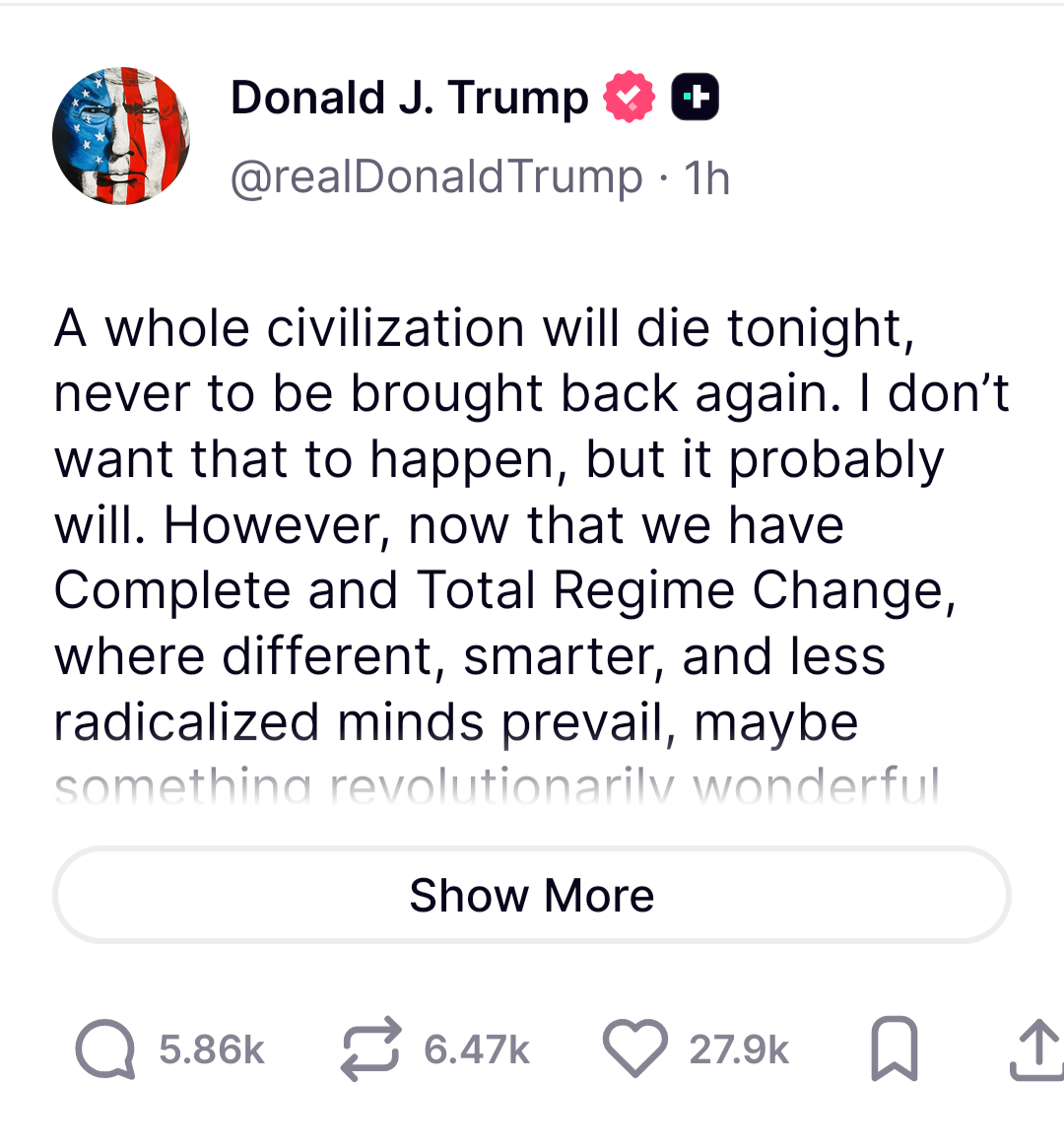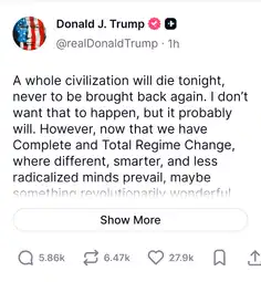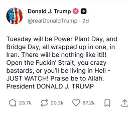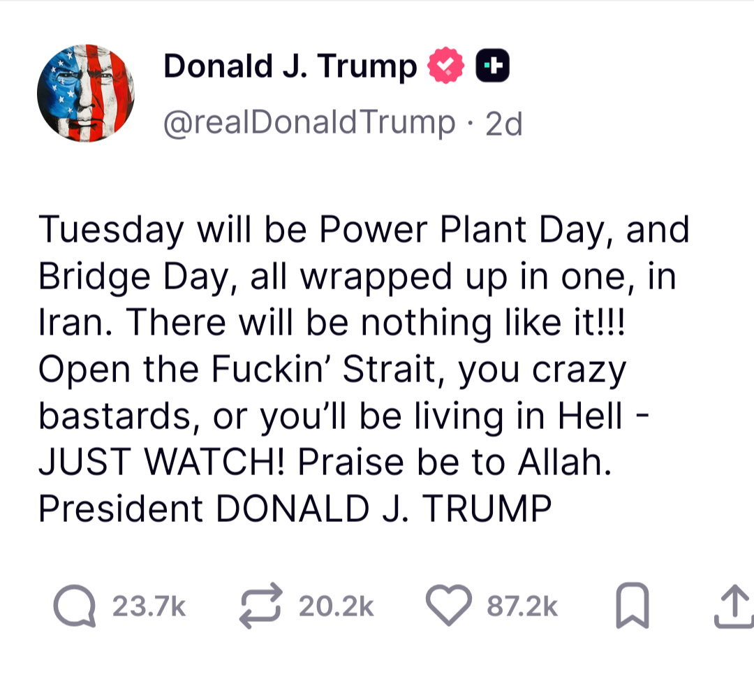 >it's real>6 hours left of Tuesday Tuesday will be Power Plant Day, and Bridge Day, all wrapped up in one, in Iran. There will be nothing like it!!! Open the Fuckin' Strait, you crazy bastards, or you'll be living in Hell - JUST WATCH! Praise be to Allah. President DONALD J. TRUMP