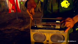 He walks to a battered yet still-functioning boom box, slamming the cassette in with deliberate force. The gears whirr, the tape spins, and the first beat drops-a distorted, bass-heavy remix of *"Girl on Fire"* reimagined for the battlefield of absurdity.