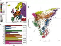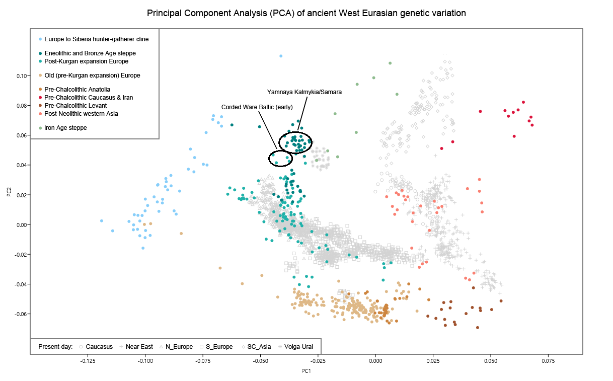 >Where is yamnayaThat's a PCA2 of Modern european + Middle Eastern & North African genetic clusters, which is an algorithm that looks at specific SNPs related to populations and plots them on a graph related to other points.