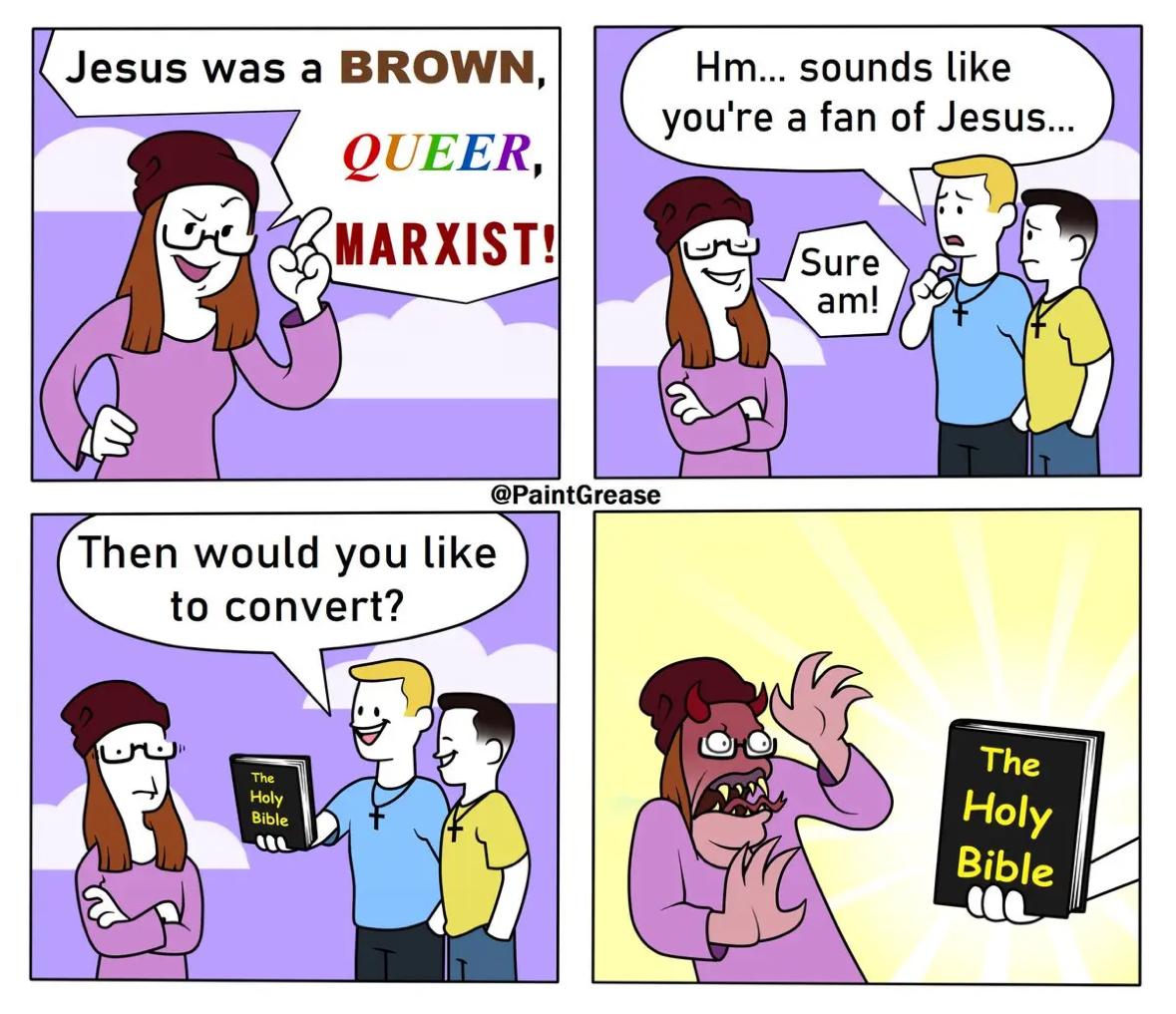 >>3222332The last one is kinda incomprehensible,the dude prays then the other dude breaks the prayer says he prays and continues doing so,was it meant to say that christians are not gay? Or that they dont like when they're prayers are interrupted