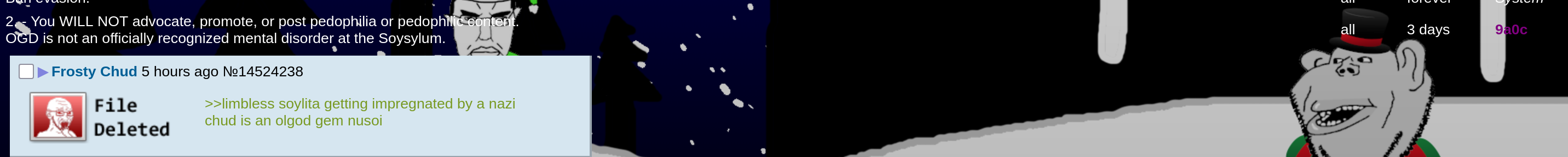 In stage 3, OGD is easily diagnosed and begins to be terminal. This is where most of the OGD screenshots (You) see in the Gallery. Became rampant after the average ban length for pedophilic jokes got chopped down to three days during mod-Quote era, but is starting to be dealt with.