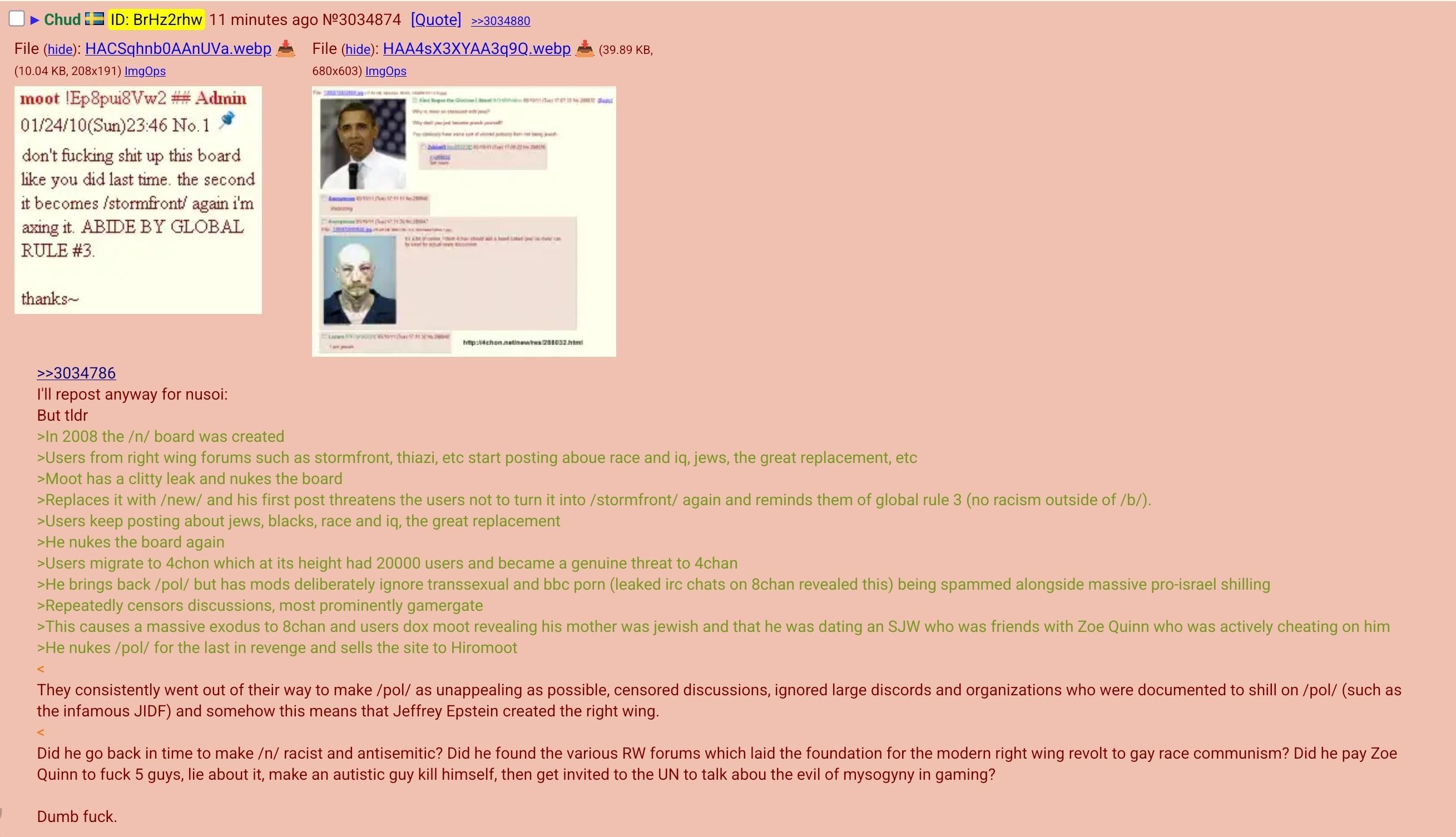 >>3225141The image on the left was written by me, I also forgot to add that /pol/ was created before he even physically met with Epstein.